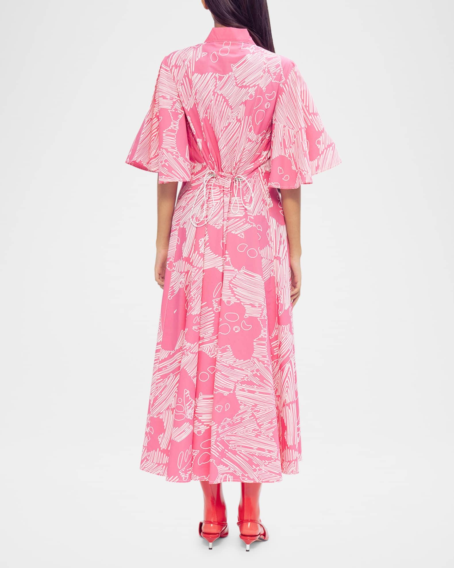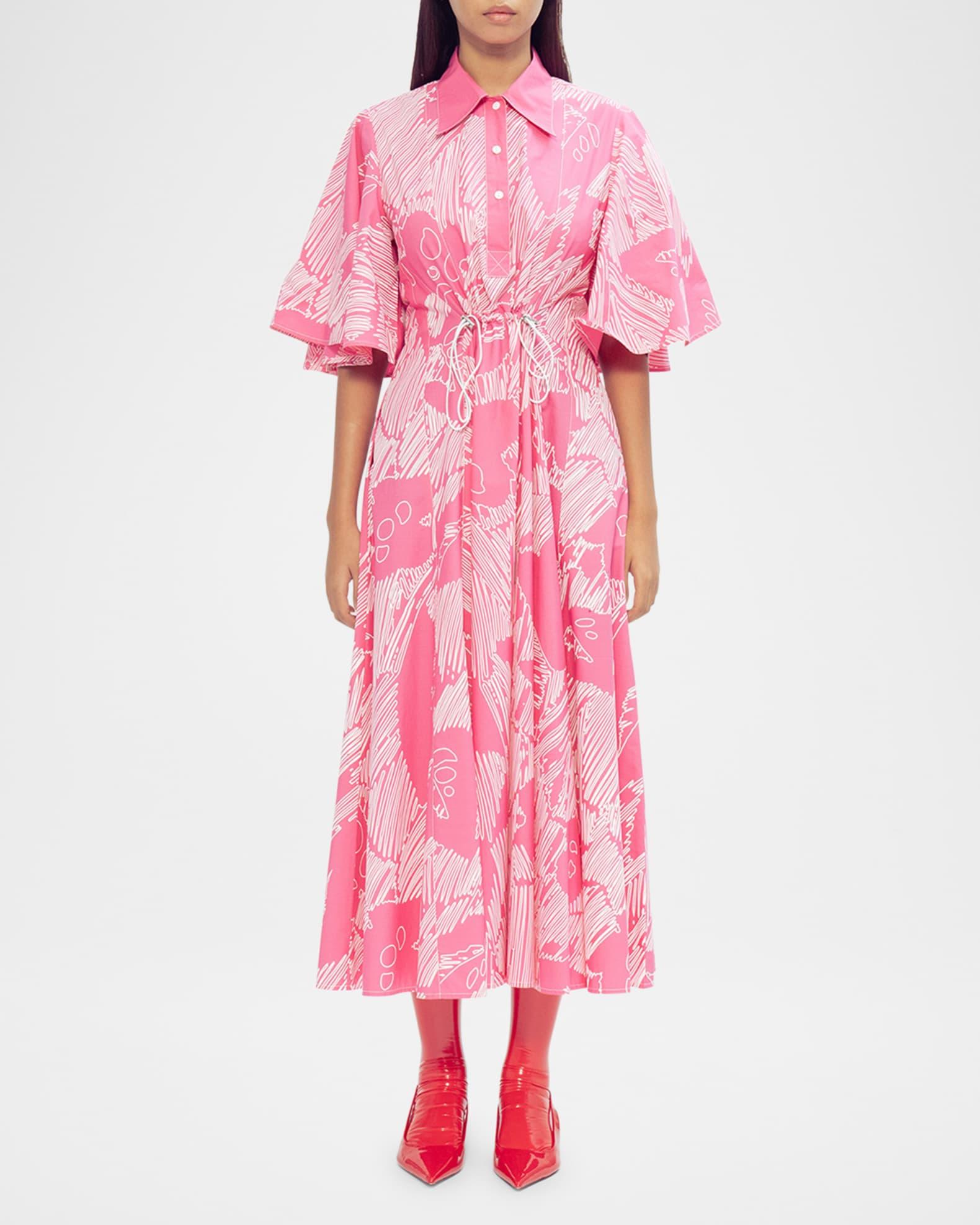 LOVEBIRDS "Cherie" midi shirtdress in an abstract print Approx. 52"L from shoulders to hem Spread collar; button front placket Elbow flutter sleeves Drawcord waist Hem falls below the knee A-line silhouette Slipover style Cotton Dry clean Imported