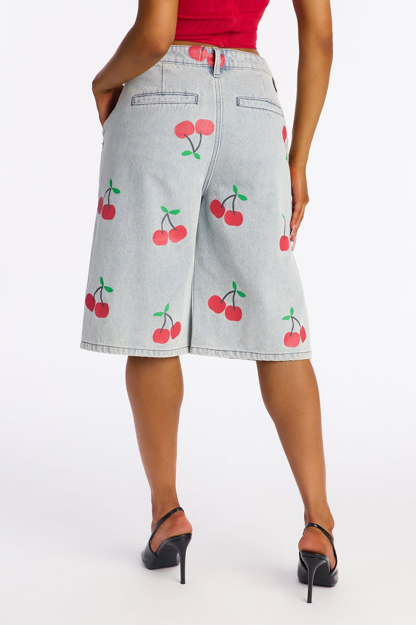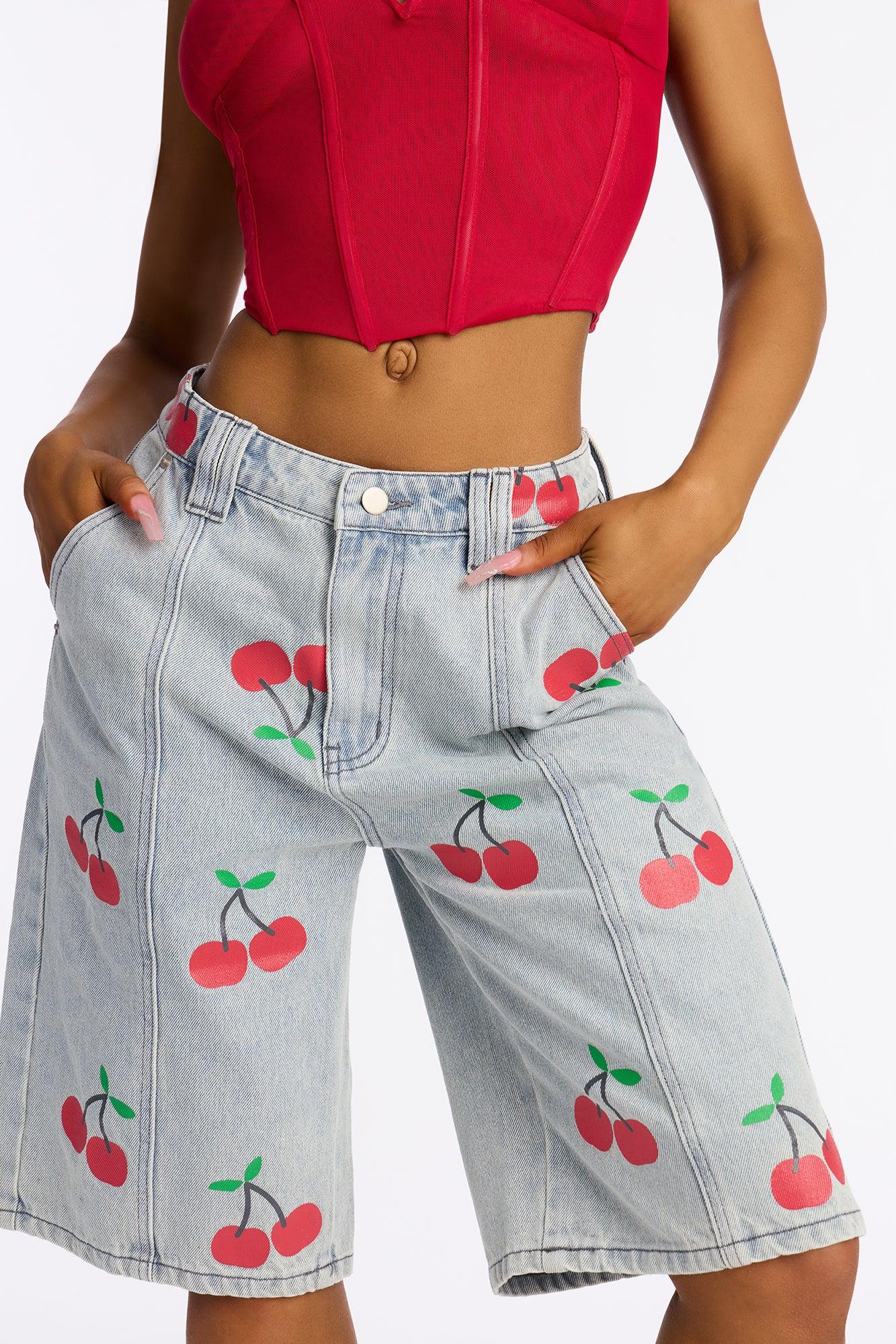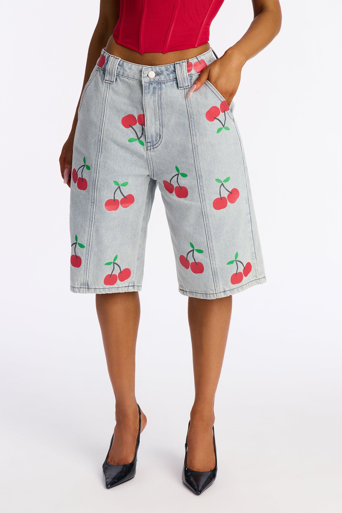 Available In Light Wash. Denim Jort Functional Trouser Pockets All Over Cherry Print Seaming Detail 11.5" Rise 12" Inseam Non-Stretch Disclaimer: Due To The Specialized Wash, Each Garment Is Unique. 100% Cotton Imported California Proposition 65WARNING: Cancer and Reproductive Harm - www.P65Warnings.ca.gov.