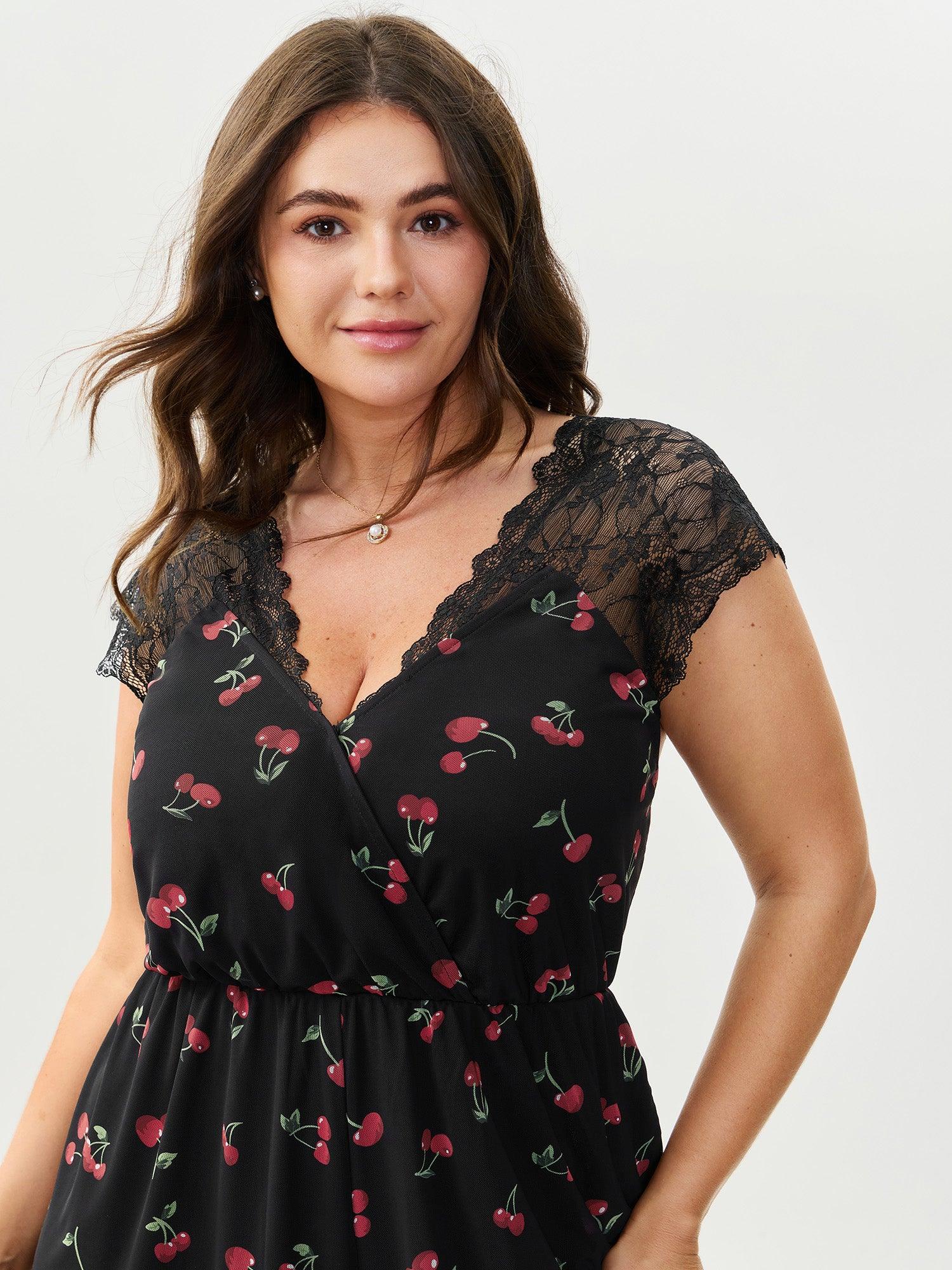 Shop Cherry Romance Lace Sleeve Lounge Romper now and redefine your style with confidence at BloomChic. Tailored for mid and plus-size women. This trendy Loungewear Women, sizes 10-30. Color:Black;Style:Romantic;Neckline:V-neck;Sleeve Type:Cap sleeve;Prints:Fruit and vegetable print;Details:Texture, See through, Gathered, Contrast, Overlapping;Pocket:Side seam pocket;Belt:No-belt;Closure Type:Non