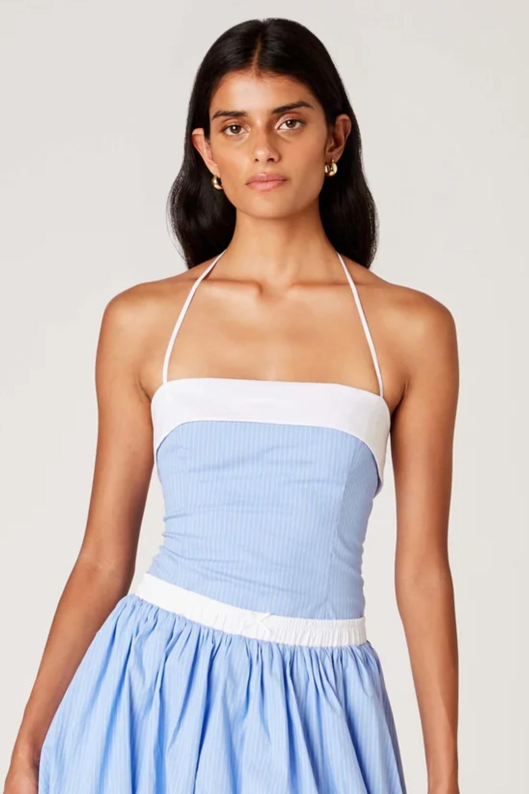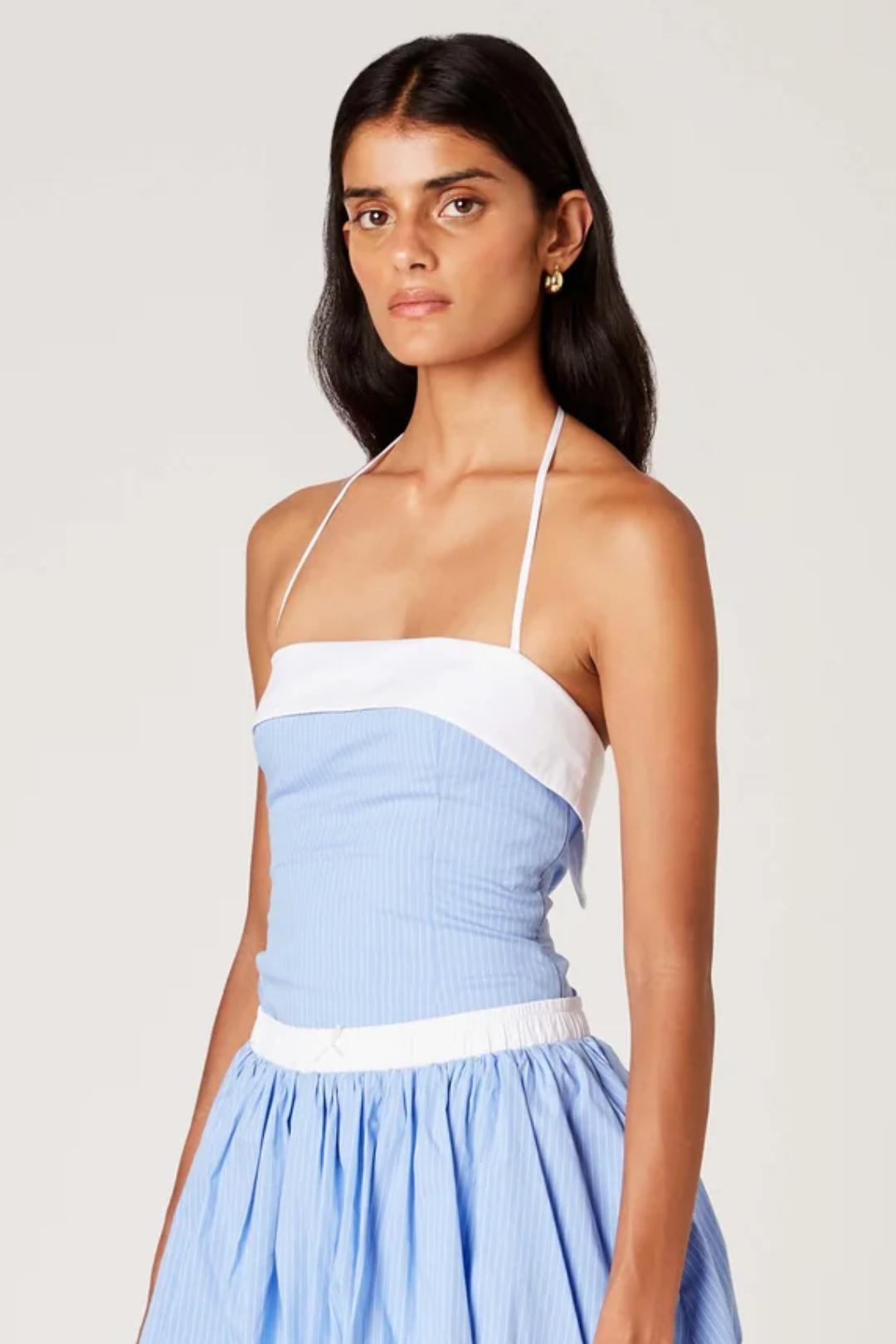 Add a touch of carefree charm and elegance with NIA's Cherry Top. It's a corset-inspired piece with subtle pinstripes, halter ties, and an adjustable lace-up back. Great for parties, special occasions, or lunch dates.