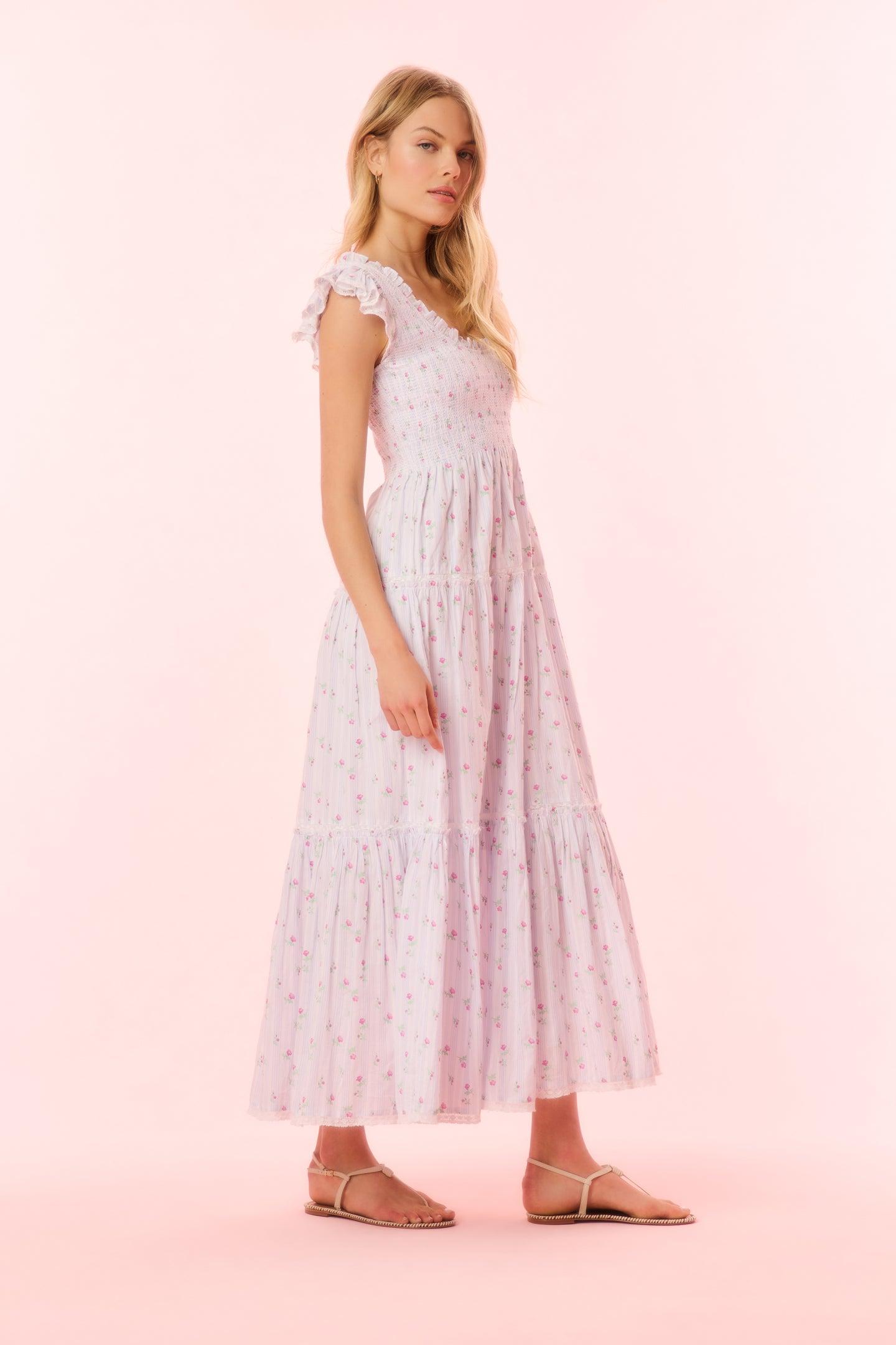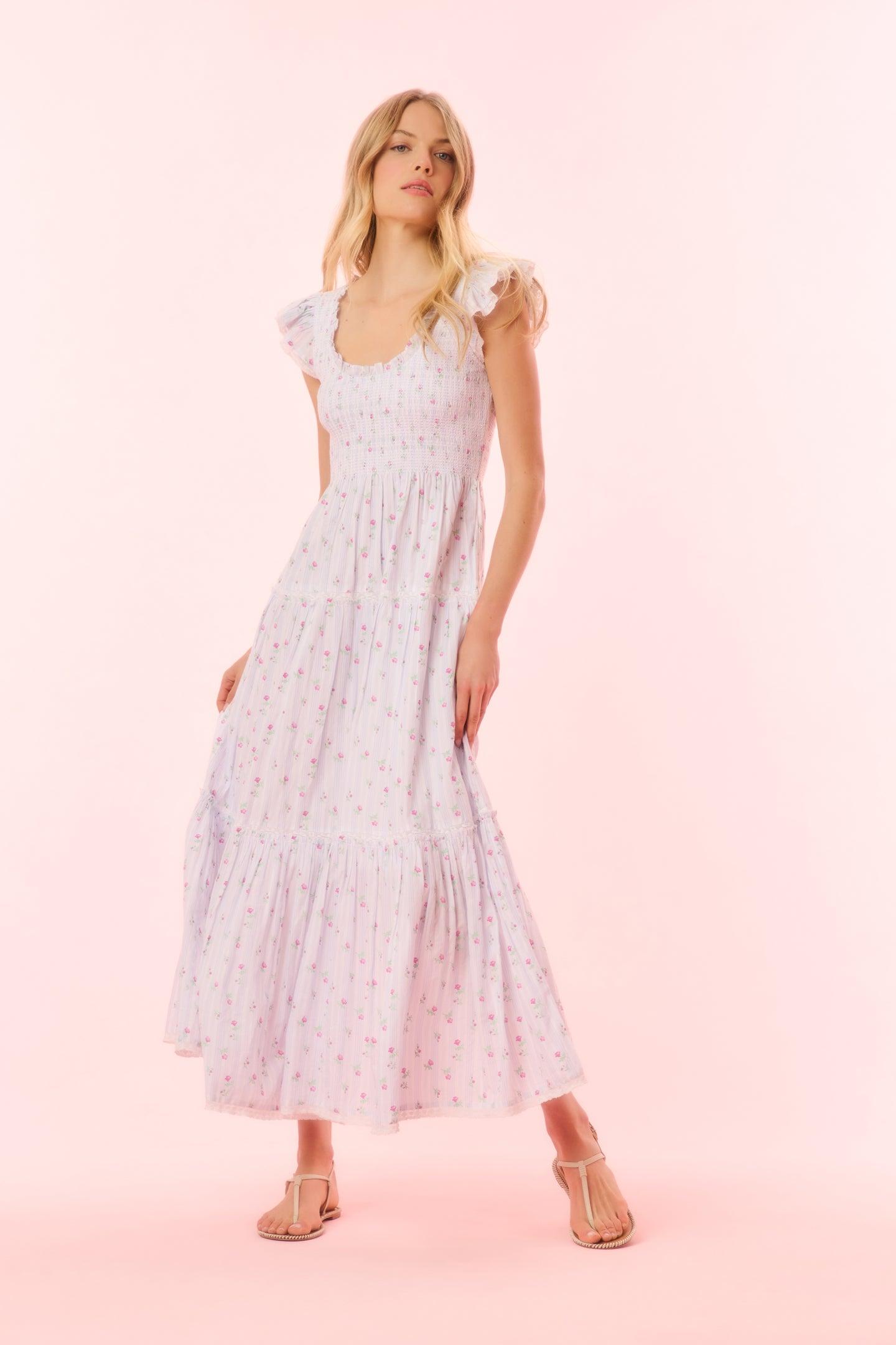 Our Chessie Dress returns with a striped cotton voile fabric featuring a ditsy floral print all over. Featured in a floral-printed, ultra-soft cotton, this airy dress is perfect for a date night or soaking up the sunshine. Ruffle sleeves flutter at the shoulders that merge around the scoop neck. The fitted smocked bodice flounces into a dreamy midi skirt decorated with custom lace insets. 100% Cotton Ruffle sleeves Scoop neckline Smocking for easy pull on