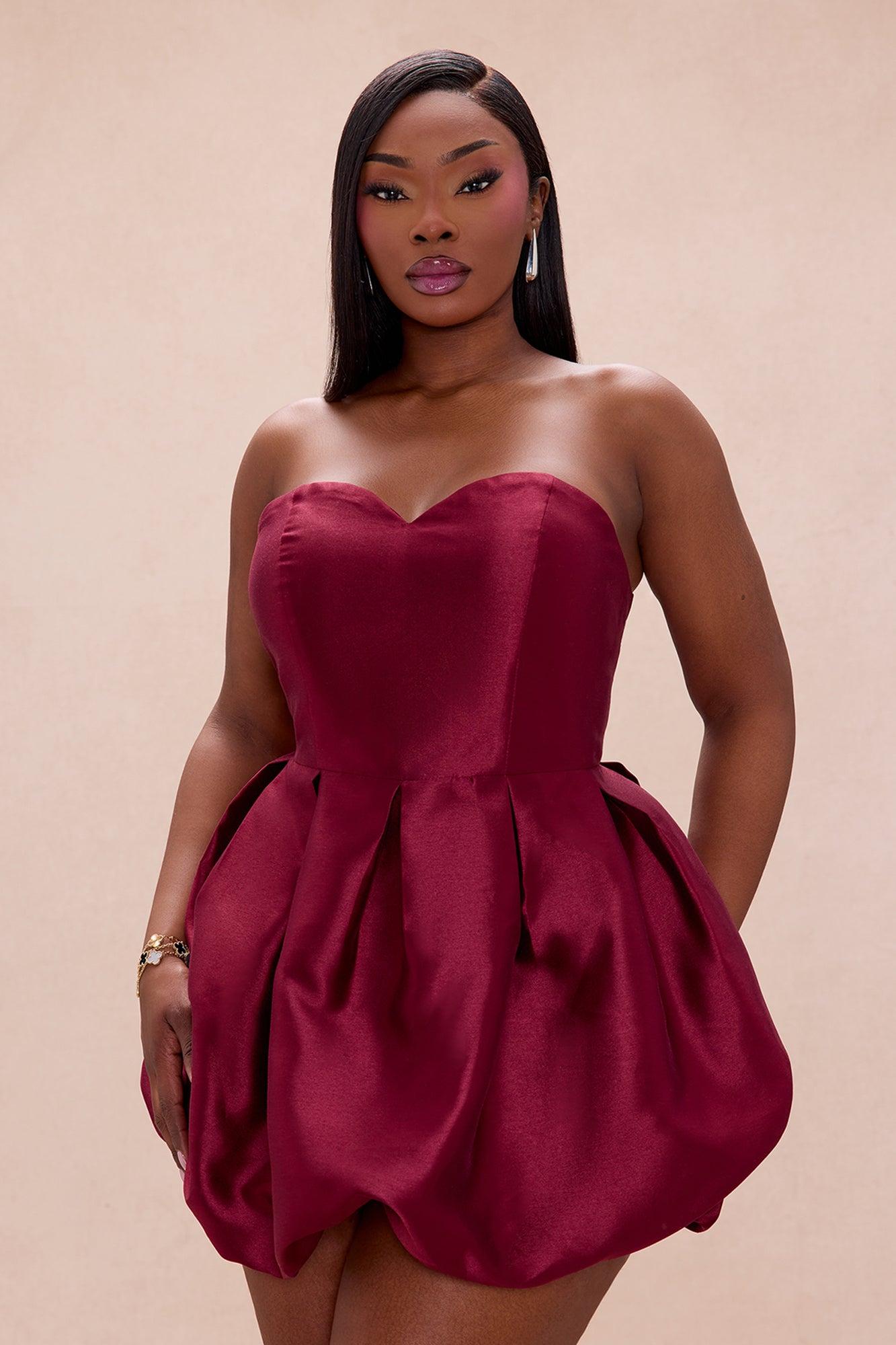 Available In Burgundy. 2 Piece Mini Dress Detached Cape Tie Neck Ruffle Trim Strapless Sweetheart Neckline Grip Tape Padded Bra Cups Boning Bubble Hem Hidden Back Zipper Closure Lined Non Stretch Shell/Lining: 100% Polyester Impo