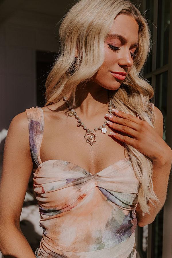 - Turn up the charm with this chic necklace! With its sweet dangling charms and pops of gold, it is perfect for giving your look a fabulous upgrade. - Gold metal material - Sage and gold colored beads - Dangling flower and heart charms as well as a rhinestone bow charm - An adjustable length chain and clasp closure Size-17-20 inches