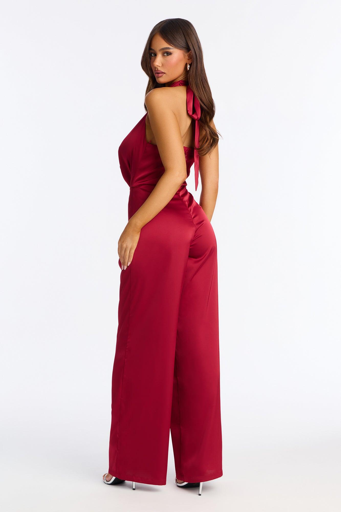 Available In Chartreuse And DarkRed. Jumpsuit Non-stretch Halter And Wide Leg Jumpsuit Cowl Neck Tie Neck Wide Leg Invisible Back Zipper 32" Inseam Self : 100% Polyester Lining : 100% Polyester Imported