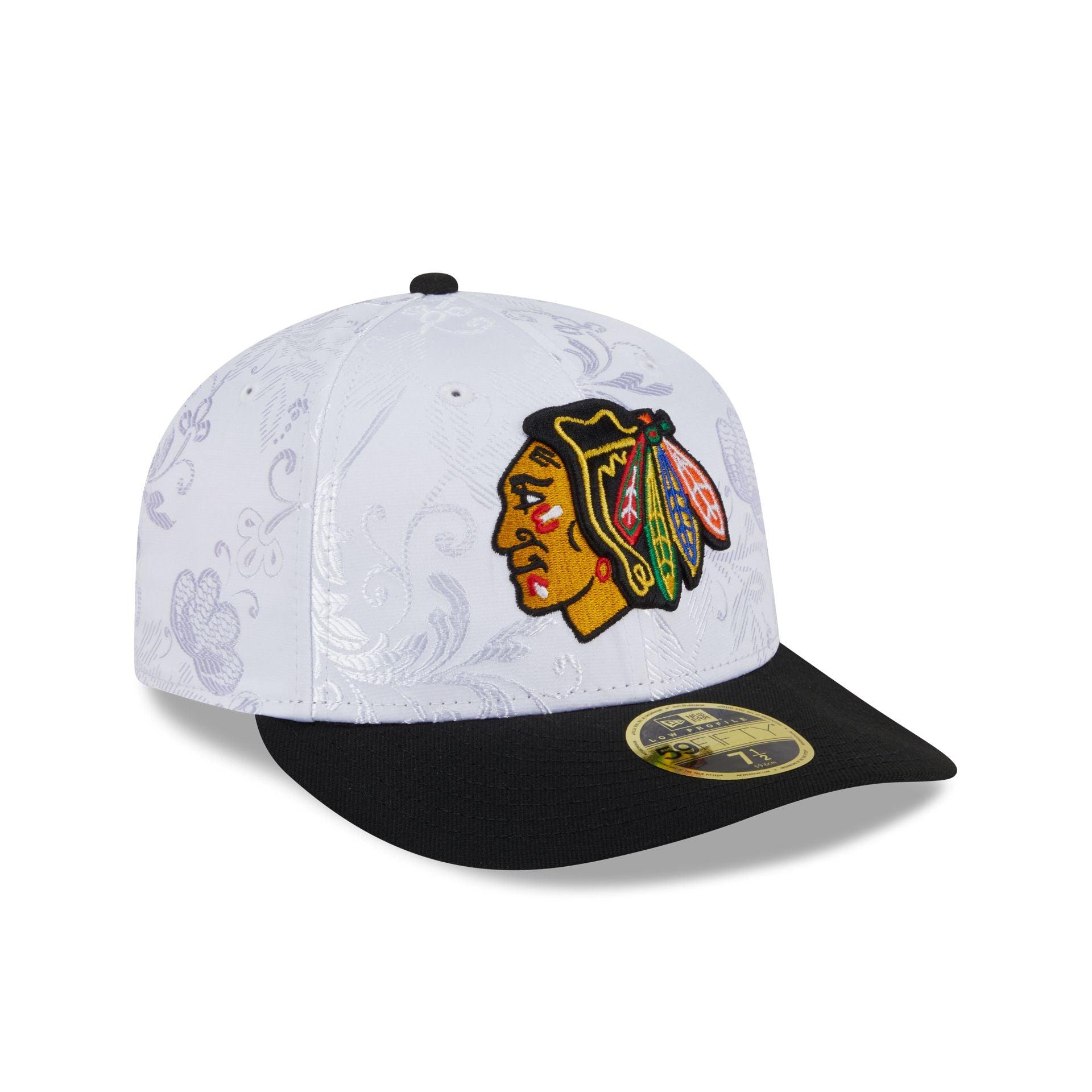 The Chicago Blackhawks Floral Shine Low Profile 59FIFTY Fitted Cap features an embroidered Blackhawks logo at the front panels with a matching NFL Shield at the rear. Additional details include a satin fabrication throughout the cap and a gray undervisor. This cap has a pre-curved visor.