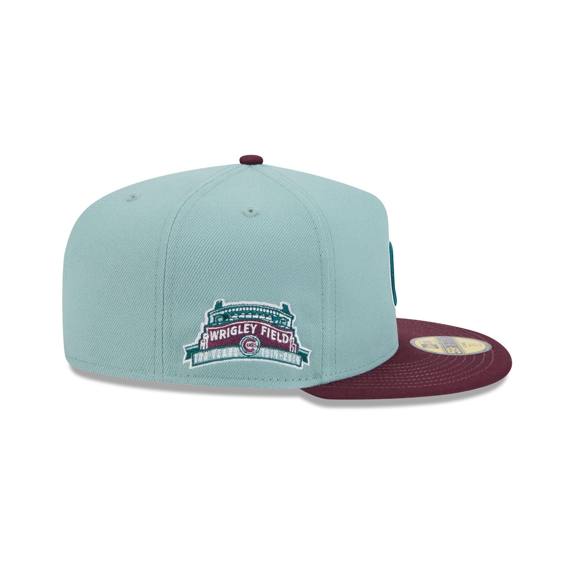 The Chicago Cubs Beach Kiss Blue 59FIFTY A-Frame Fitted Cap features an embroidered Cubs logo at the front panels with a matching MLB Batterman logo at the rear. Additional details include a Wrigley Field patch at the right-wear side and a gray undervisor.