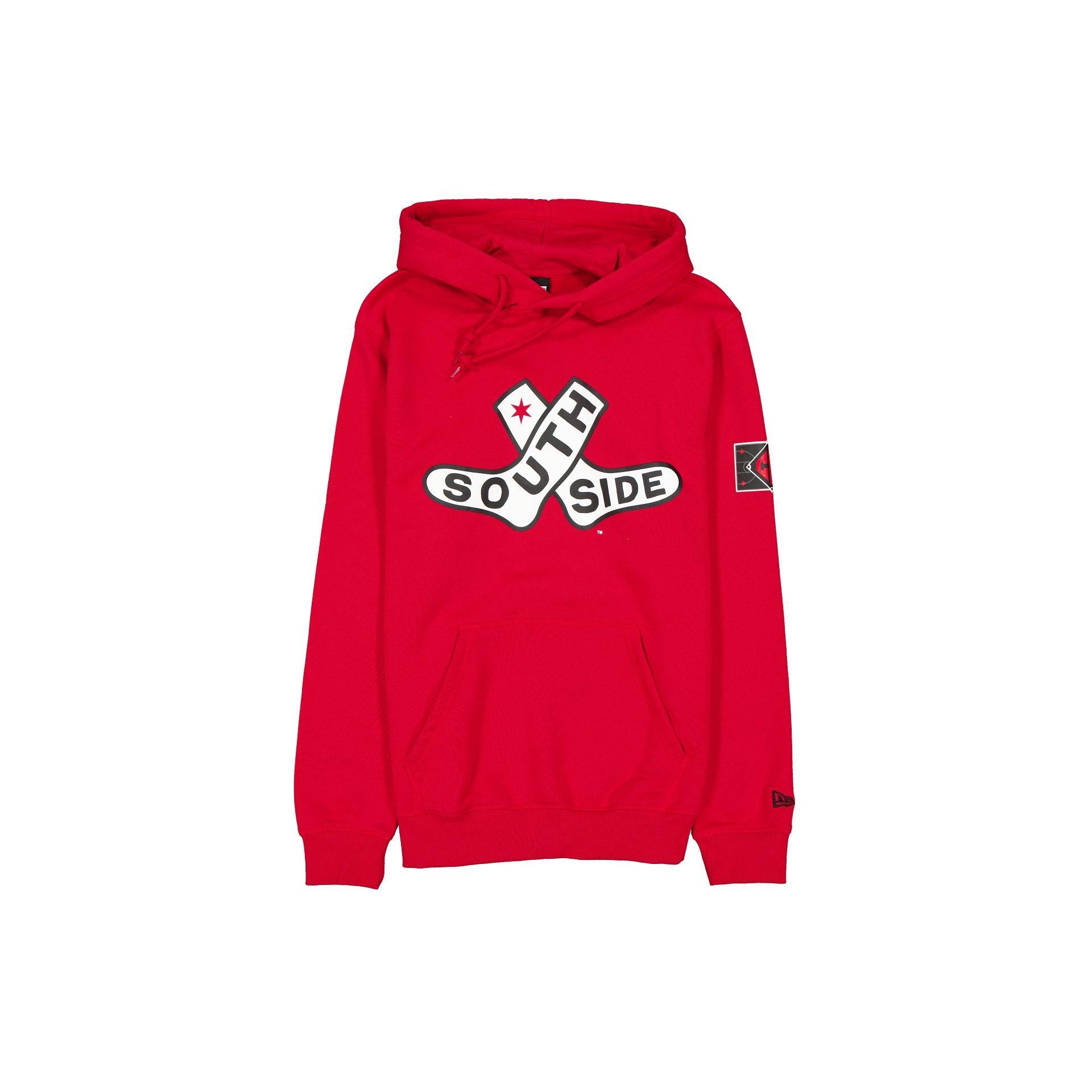 The Chicago White Sox City Connect Red Hoodie features a screen-printed White Sox logo at the front with a "Southside" graphic at the left-wear sleeve. Fabric: 80% Cotton, 20% Polyester