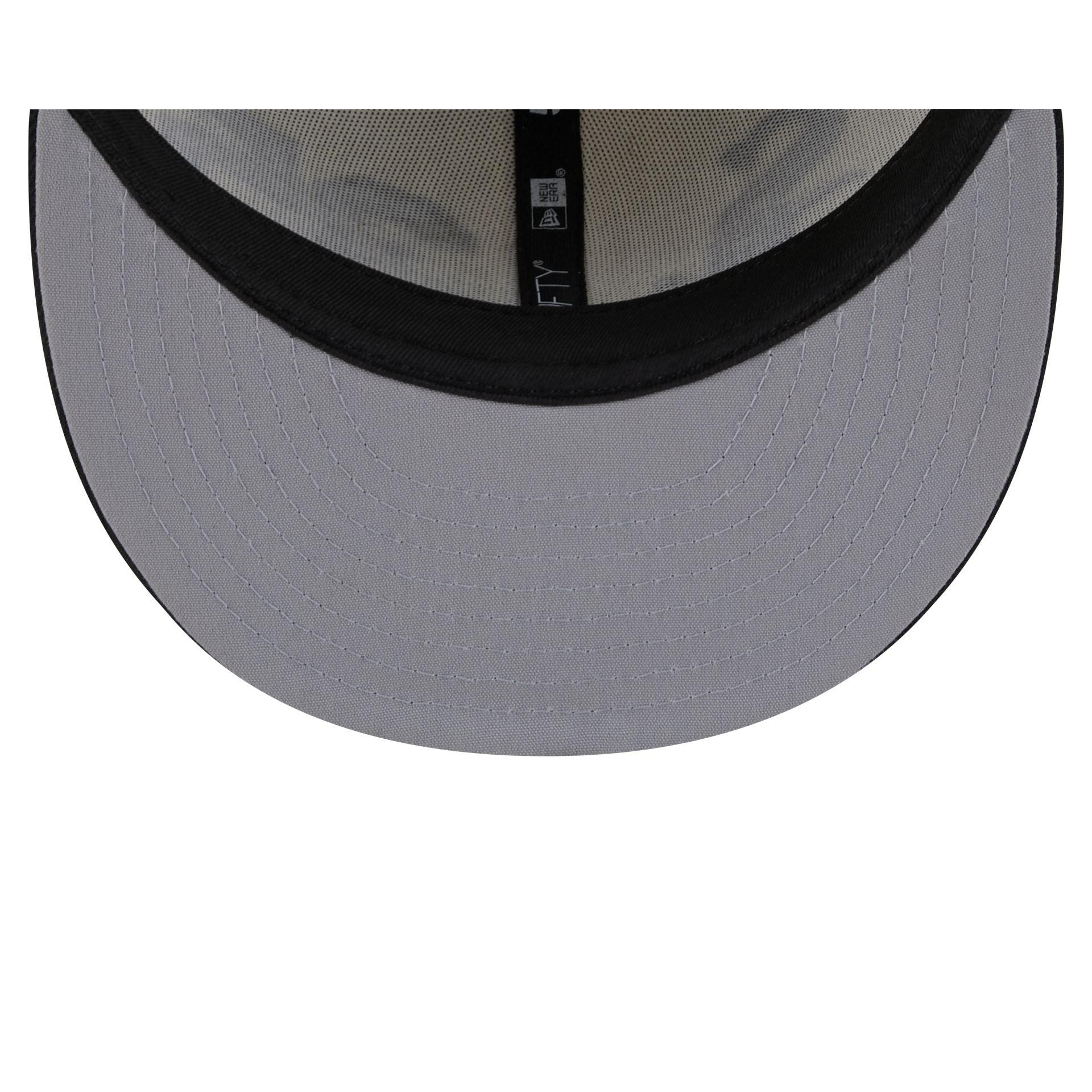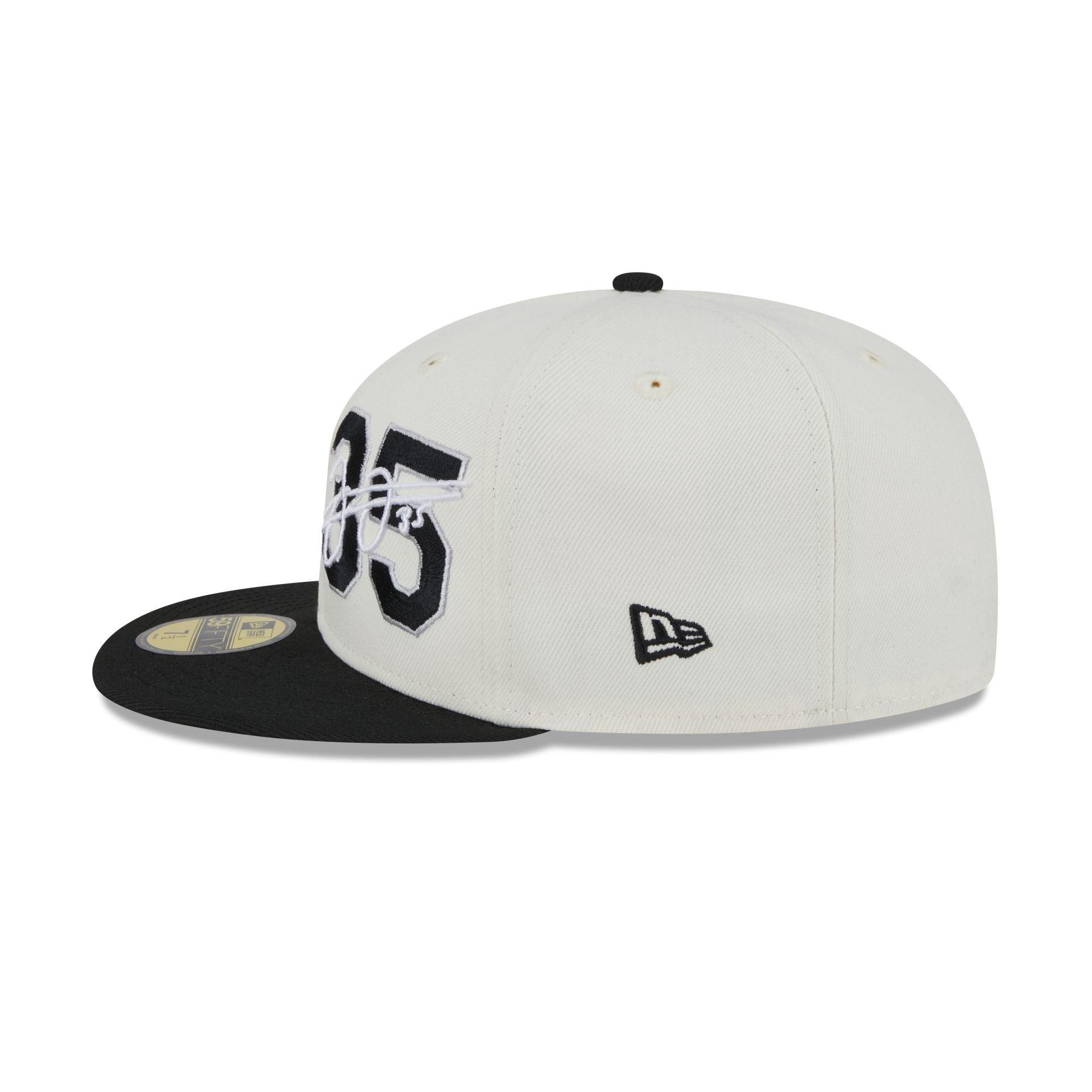 The Chicago White Sox Frank Thomas Chrome White 59FIFTY Fitted Cap features an embroidered White Sox logo at the right panel and the player's signature and number at the right. Additional details include an MLB Batterman logo at the rear and a gray undervisor.