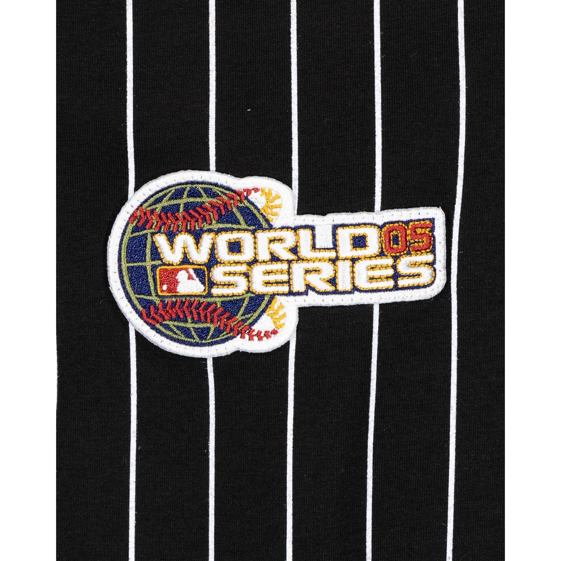 The Chicago White Sox Logo Select Pinstripe Hoodie features a chenille applique White Sox logo at the left chest with team patches at each sleeve and an embroidered team wordmark at the rear. Fabric: 52% polyester, 42% cotton, 6% spandex