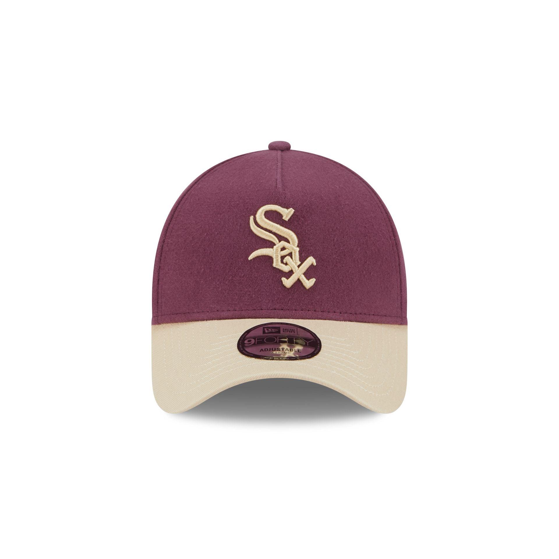 The Chicago White Sox Moleskin Crown Maroon 9FORTY A-Frame Snapback features an embroidered White Sox logo at the front panels with an adjustable snapback closure at the rear and a tan undervisor.