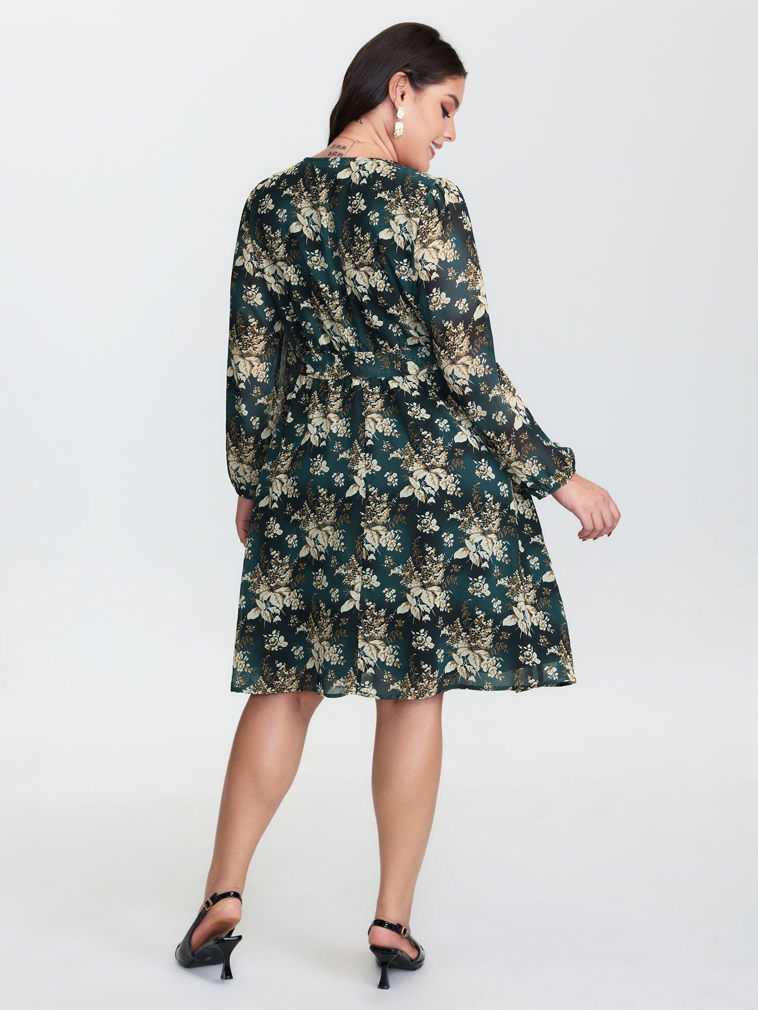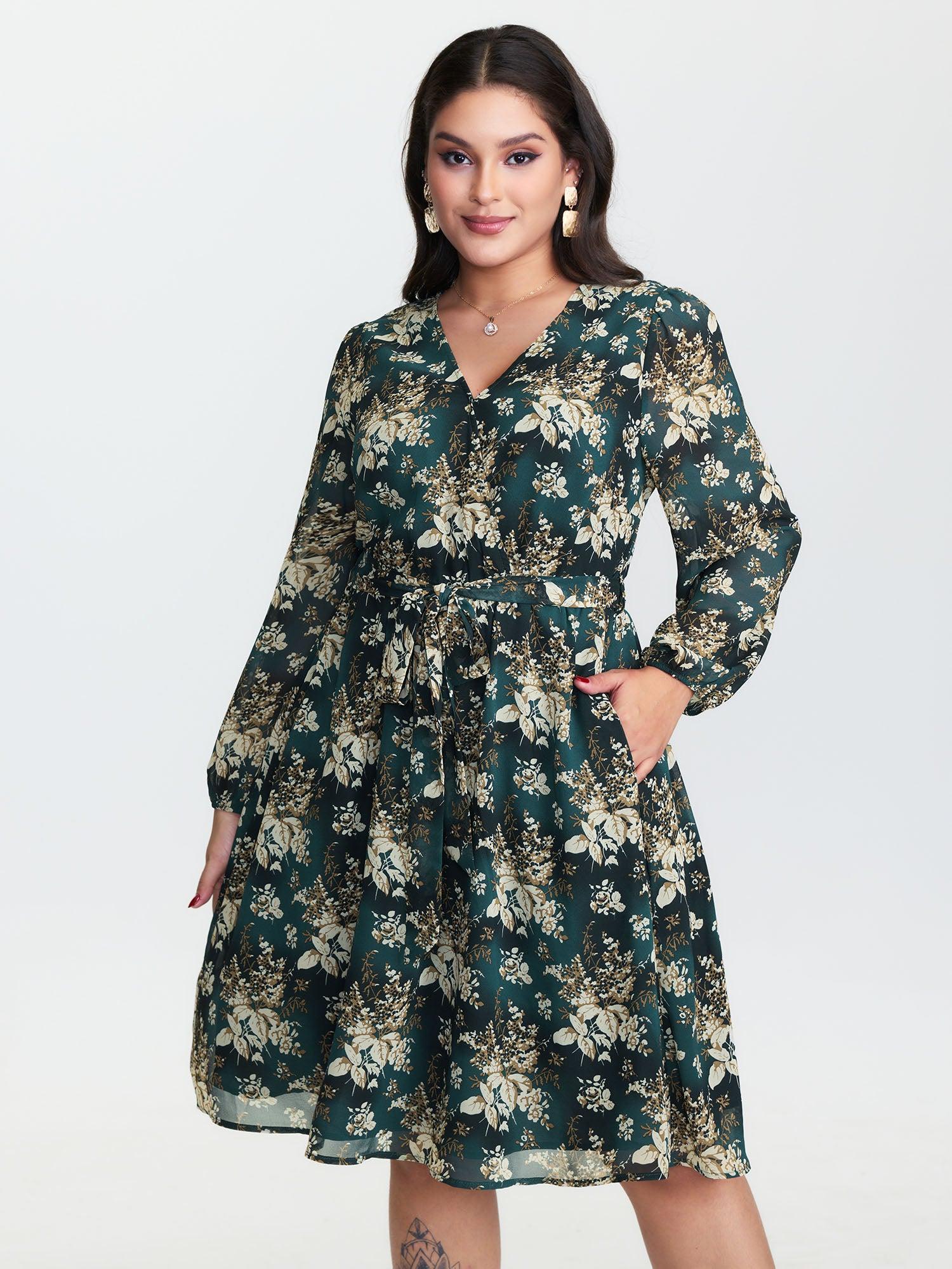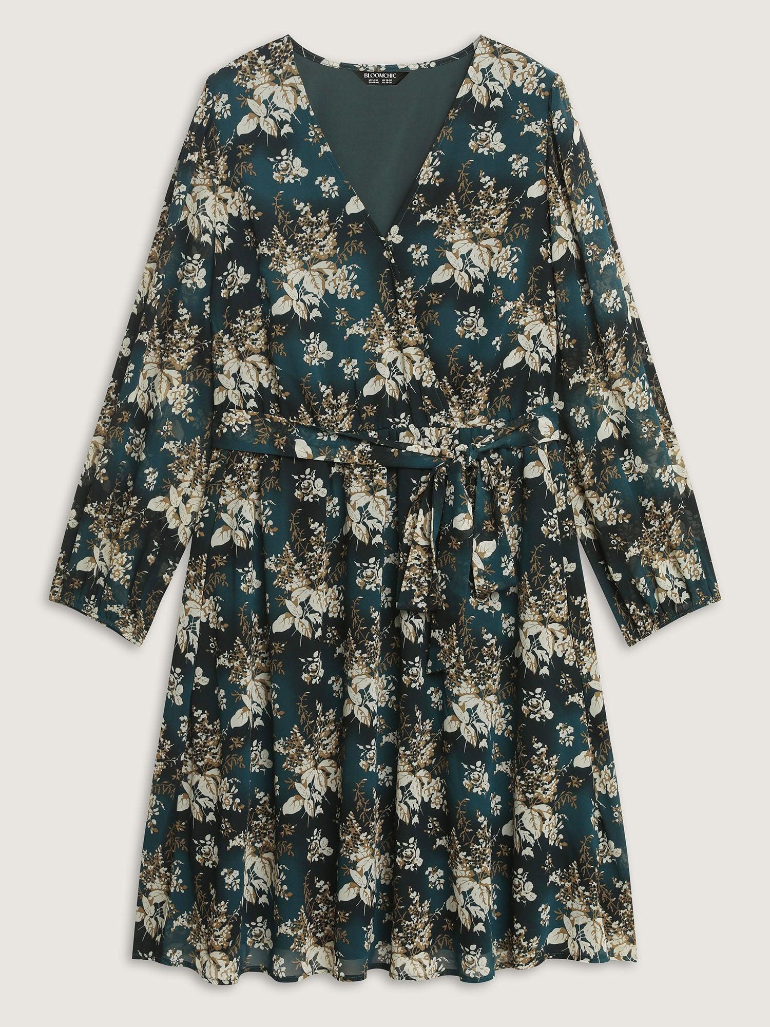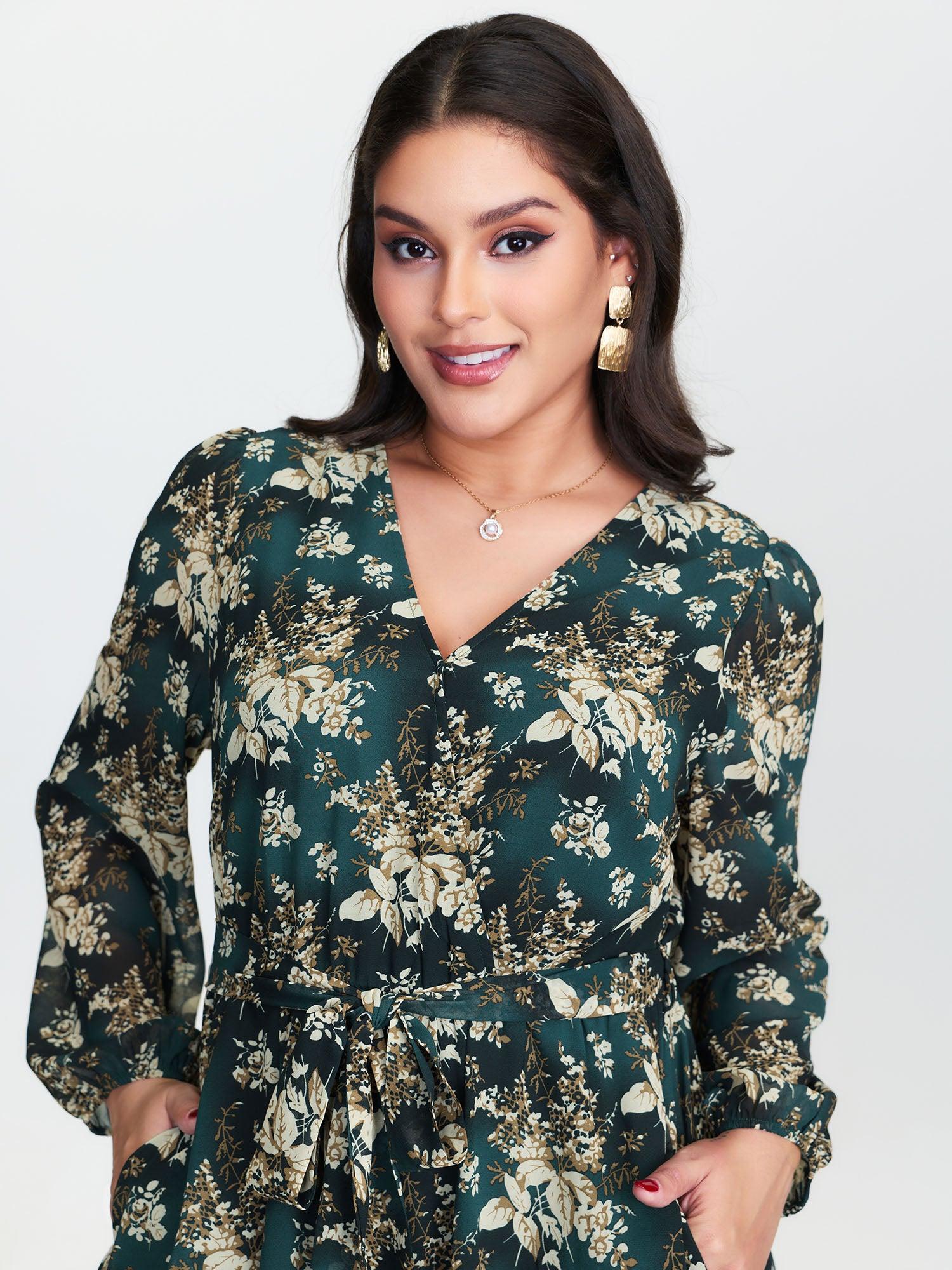 Shop Chiffon Floral Surplice Neck Belt Midi Dress now and redefine your style with confidence at BloomChic. Tailored for mid and plus-size women. This trendy Dress, sizes 10-30. You can never go wrong with BloomChic Dresses. Color:Cyan;Style:Romantic;Neckline:Overlap Collar;Sleeve Type:Lantern Sleeve;Prints:Ditsy floral;Details:Tie knot, Gathered, Contrast, Overlapping;Pocket:Side seam pocket;Belt:Belt;Closure Type:Non