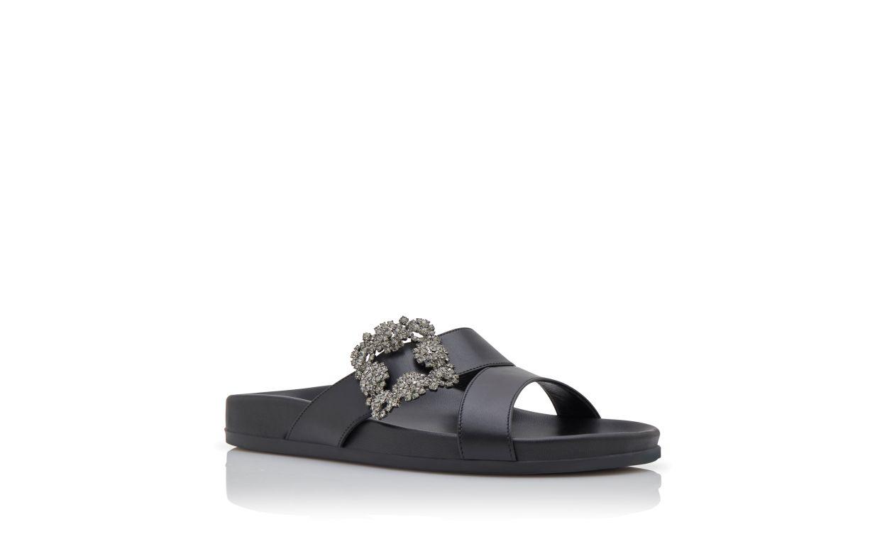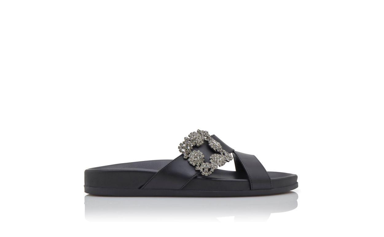 CHILANGHI Black Calf Leather Jewel Buckle Flat Mules