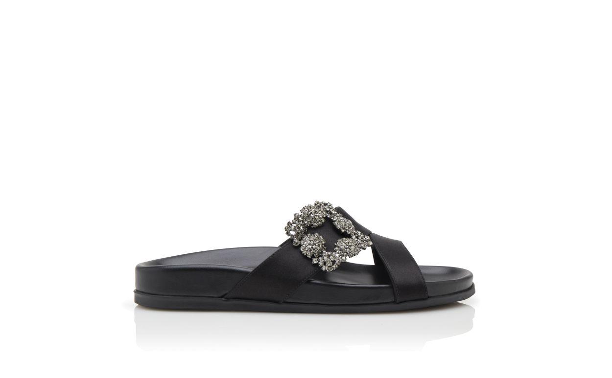 CHILANGHI Black Satin Jewel Buckle Flat Mules