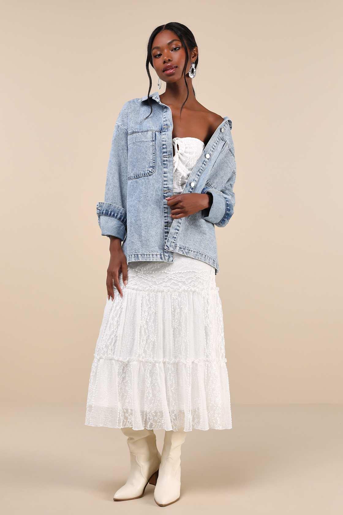 Every layered look you create with the Lulus Chill Charm Light Wash Denim Button-Up Shacket will be effortlessly cool! Sturdy, cotton-blend denim shapes this trendy shacket that features a classic collared neckline framed by long sleeves with drop shoulders and button cuffs. The slightly oversized bodice boasts twin patch pockets and a functional button placket that continues down to the notched hem.