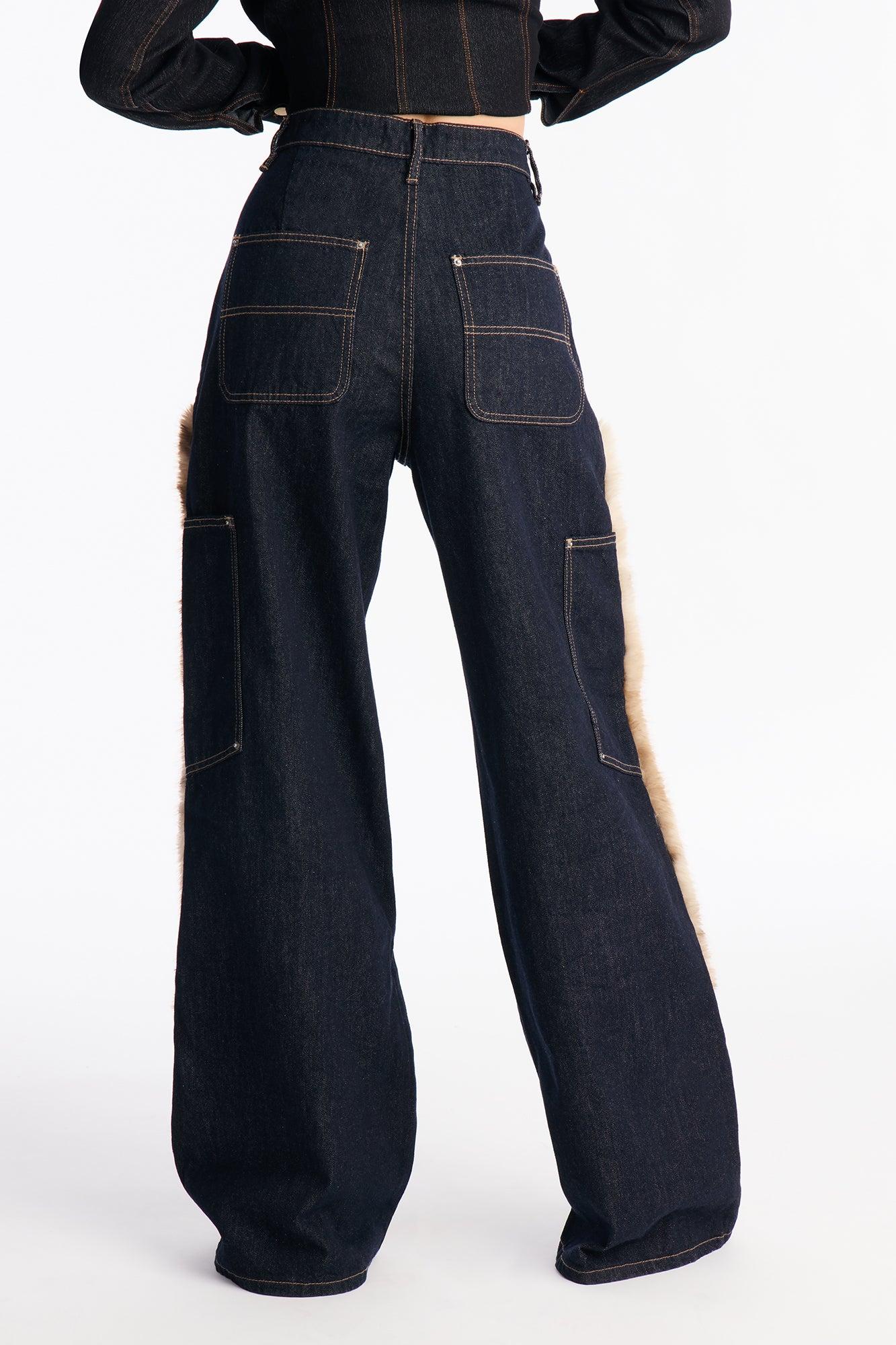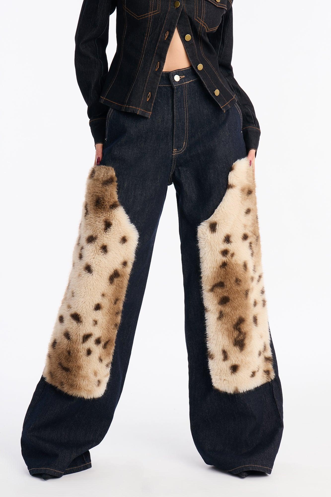 Available In Dark Denim. Wide Leg Jean Cargo Pockets Leopard Print Faux Fur Trim Utility Panel Baggy Fit 12” Rise 34” Inseam Non-Stretch Disclaimer: Print Placement Will Vary. Self1: 90% Cotton 10% Rayon Self2: 100% Polyester Imported