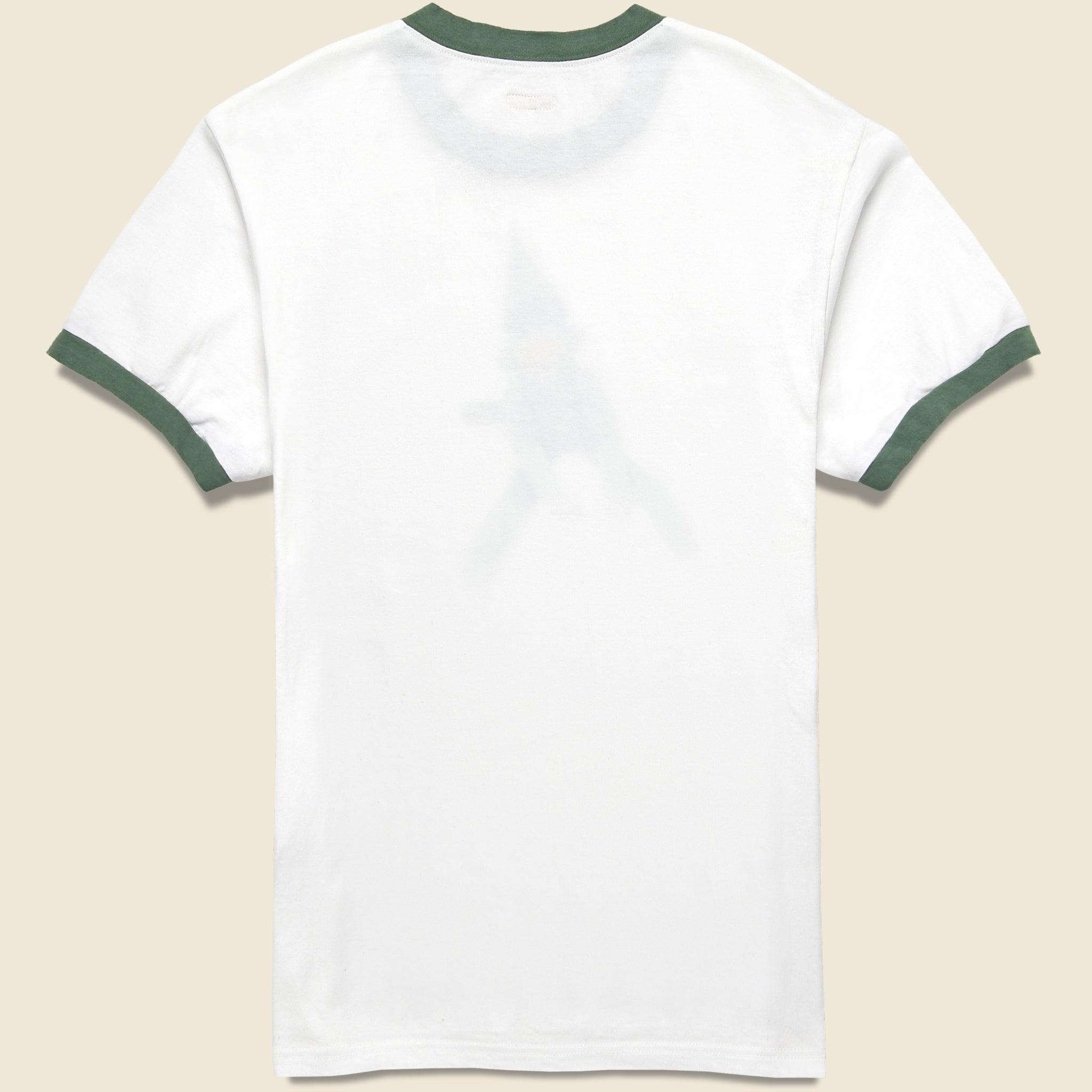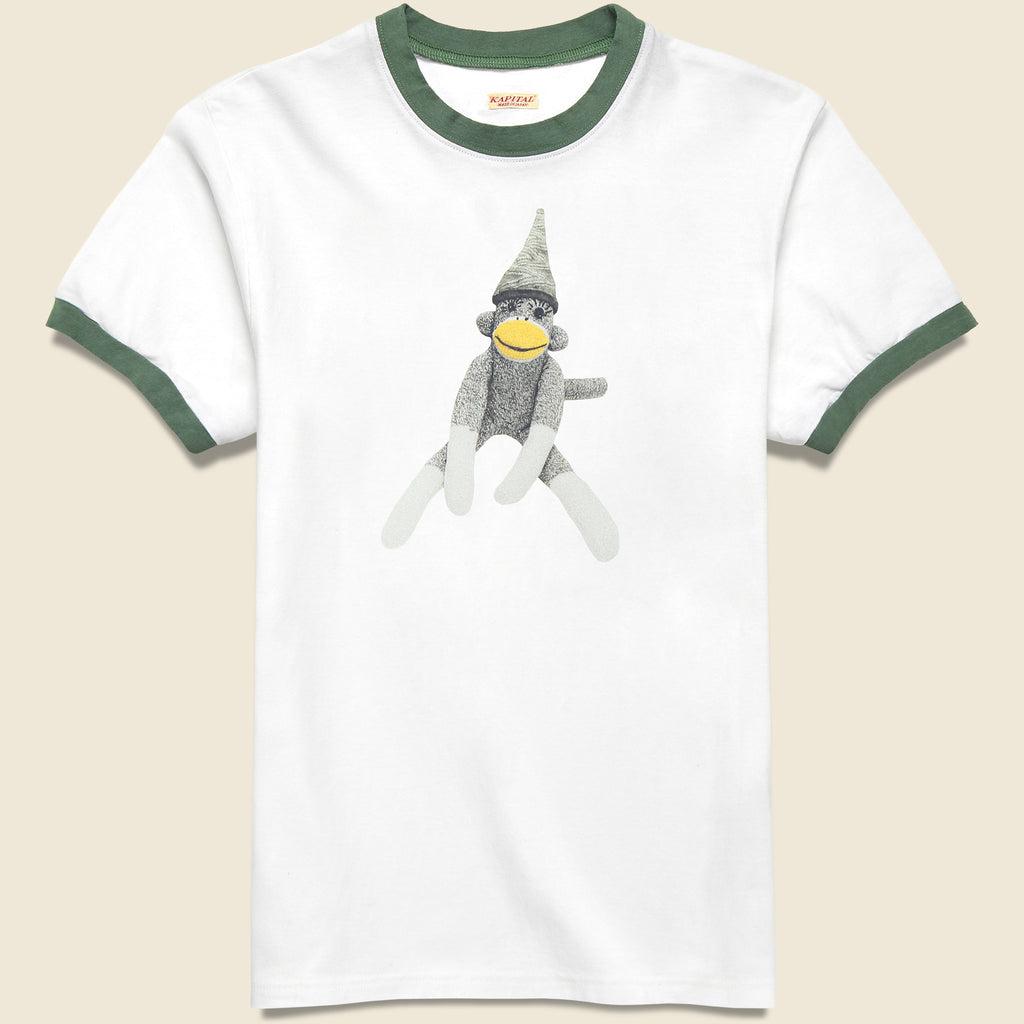 This Ringer Tee from Kapital is made with soft, fine-knit cotton that’s been screenprinted with a full-color Kapital sock monkey graphic across the chest and detailed with contrast sleeve bands and collar for a classic finish. It has a slim fit for Kapital so we recommend taking one size up from your normal size.