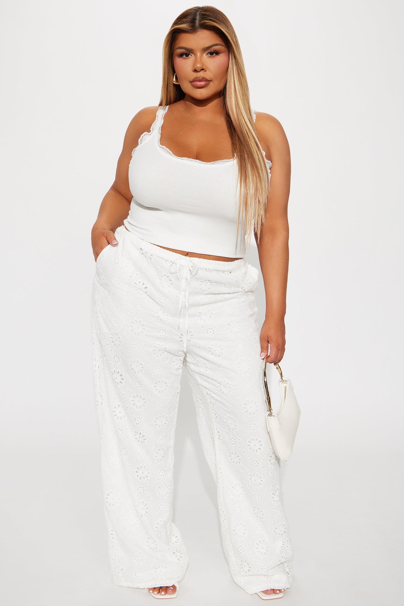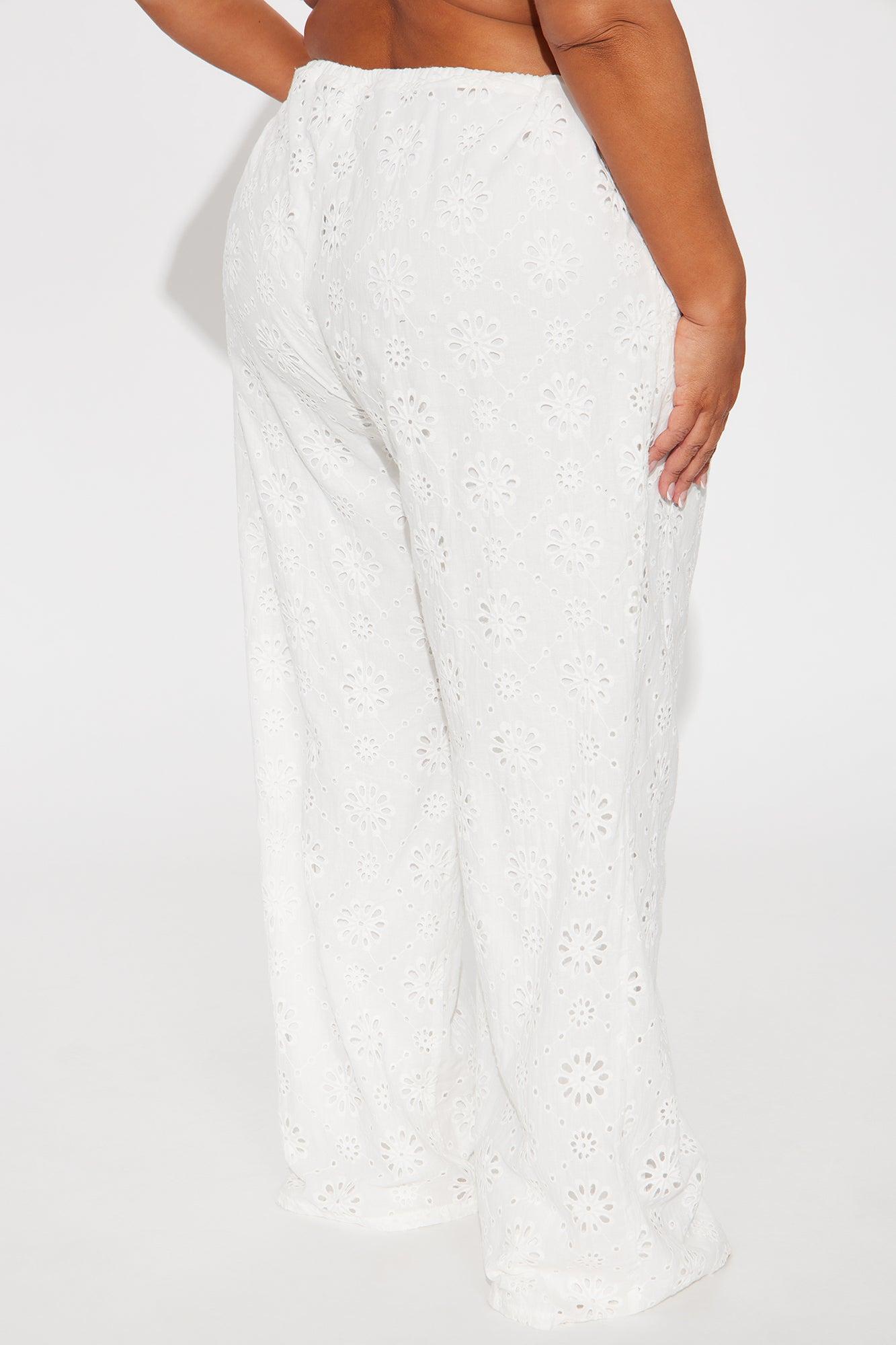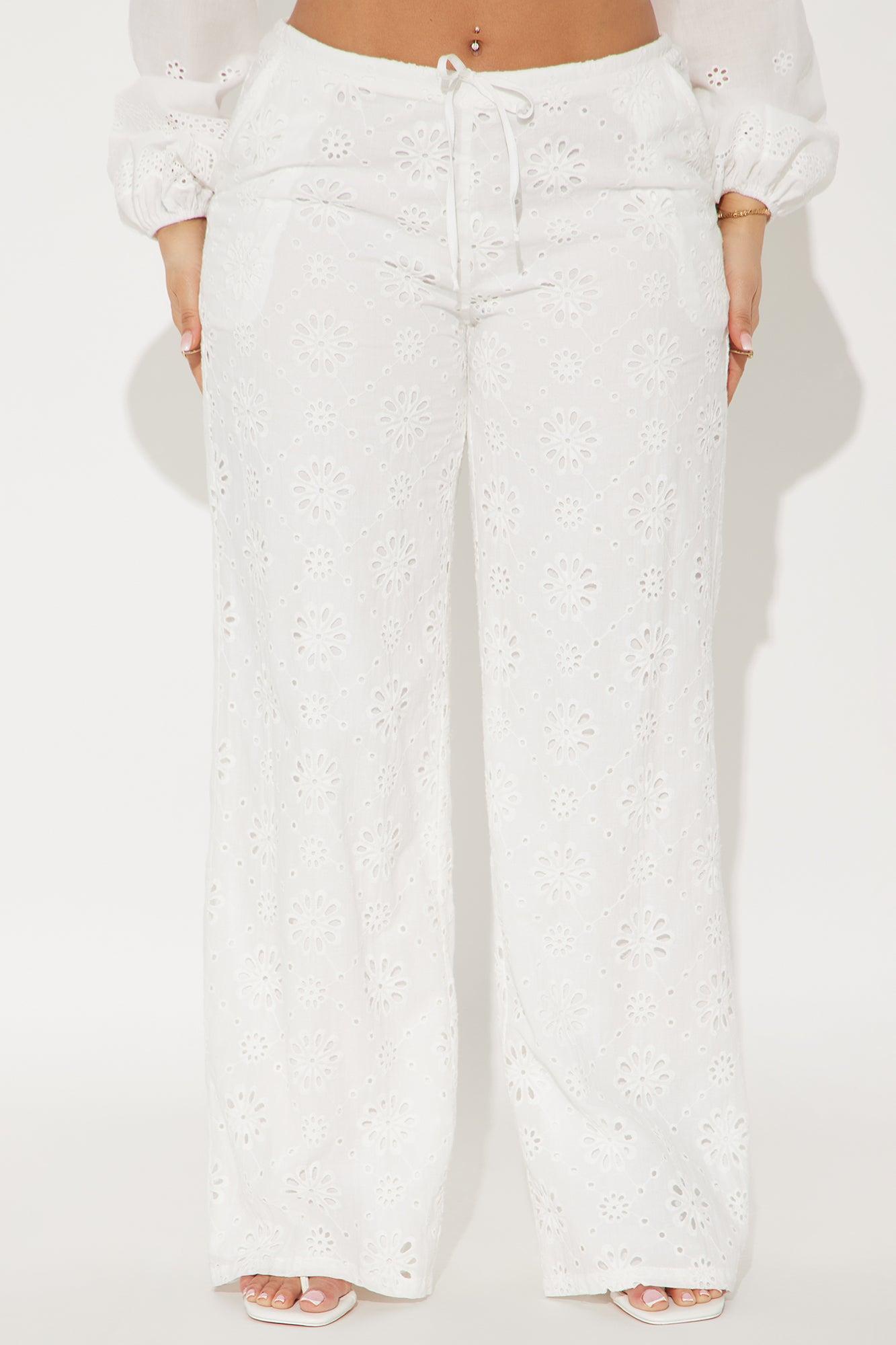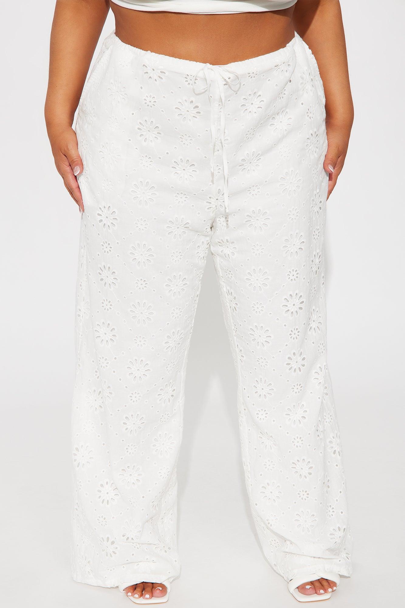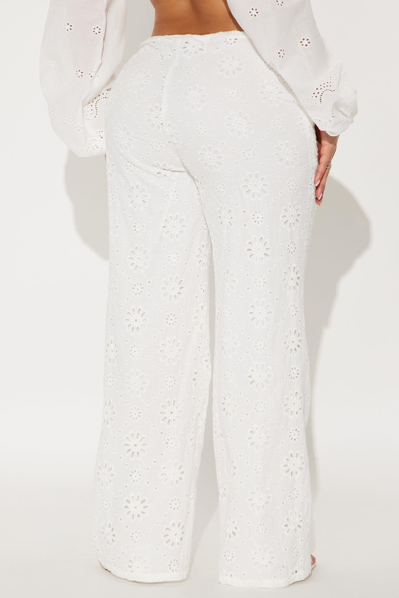 Available In White. Eyelet Pant Mid Rise Pull On Drawstring Hand Pockets Wide Leg Fully Lined Non Stretch 31" Inseam Self: 100% Cotton Lining: 100% Polyester Imported