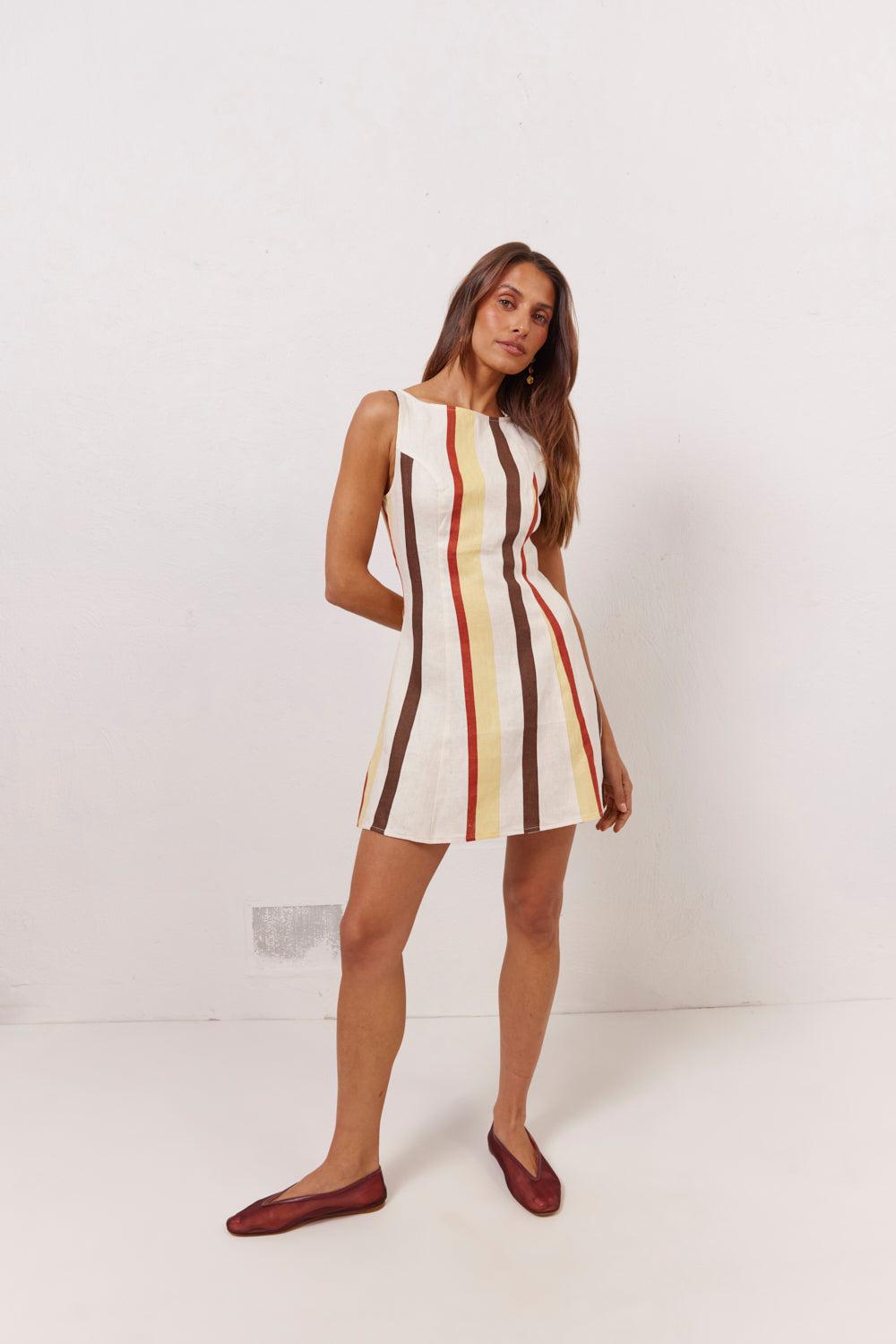 Details Exclusive in-house print 100% Linen Back waist tie Centre back zip Length 82cm / 32in (taken from a size AU 8 shoulder to hem) Cold Hand Wash / Cool Iron On Reverse Designed in Australia Size & Fit Dom is 170cm / 5ft 7in - wearing size AU 8 Paige is 178cm / 5ft 10in - wearing size AU 8 View our size guide for more information