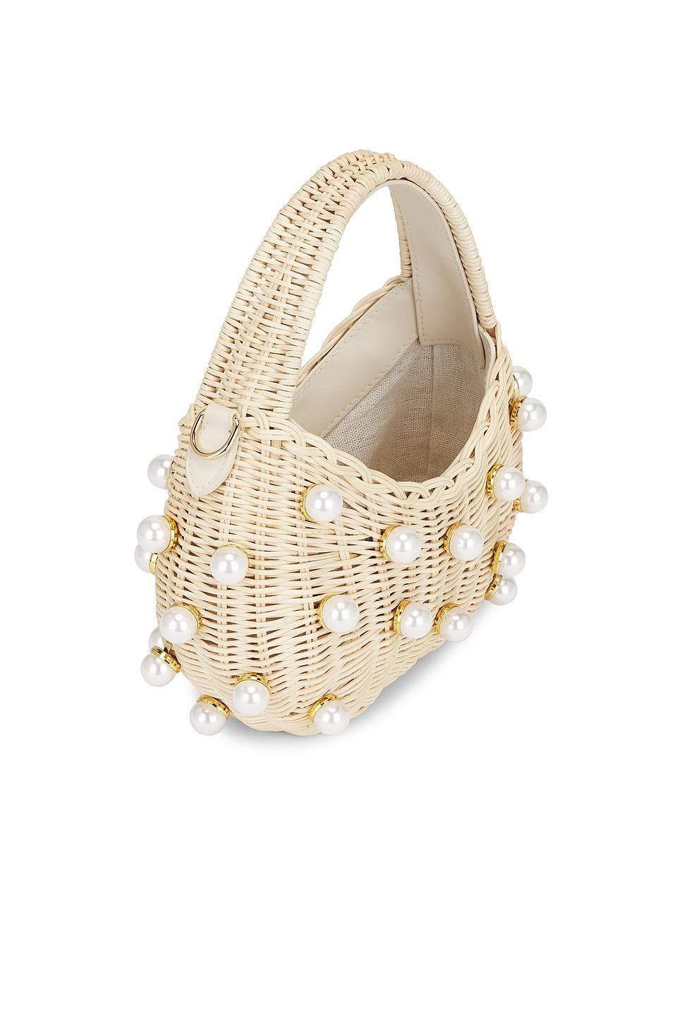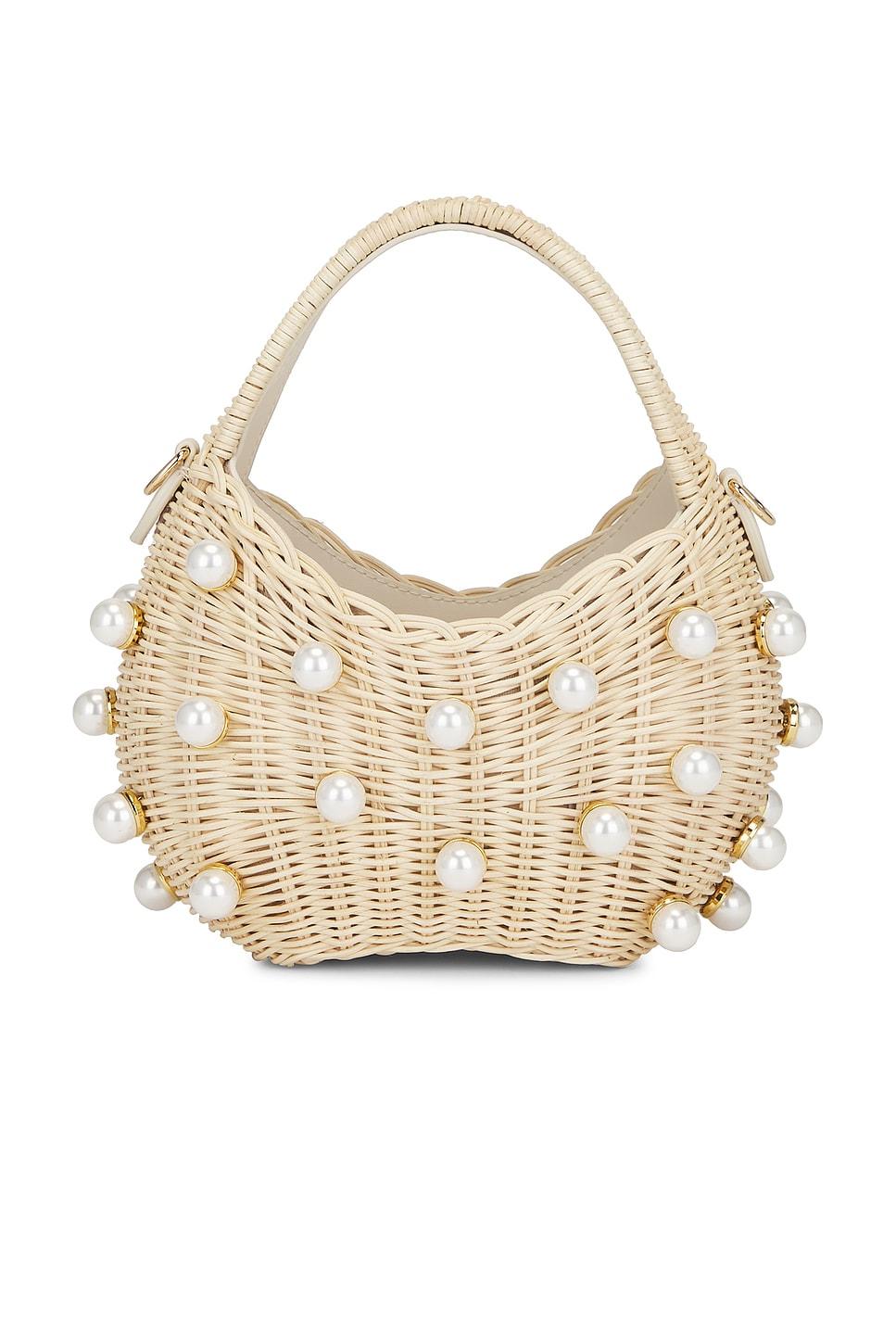 Faux pearl embellished wooden rattan exterior with textile lining. Open top. One main compartment. Interior card slot. Detachable faux leather shoulder strap. Measures approx 9" W x 4.5" H x 2.5" DShoulder strap with a 22.5" dropTop handle with a 5.25" drop. Made in China. Revolve Style No. BTBR-WY90. Manufacturer Style No. BG-SP25002.