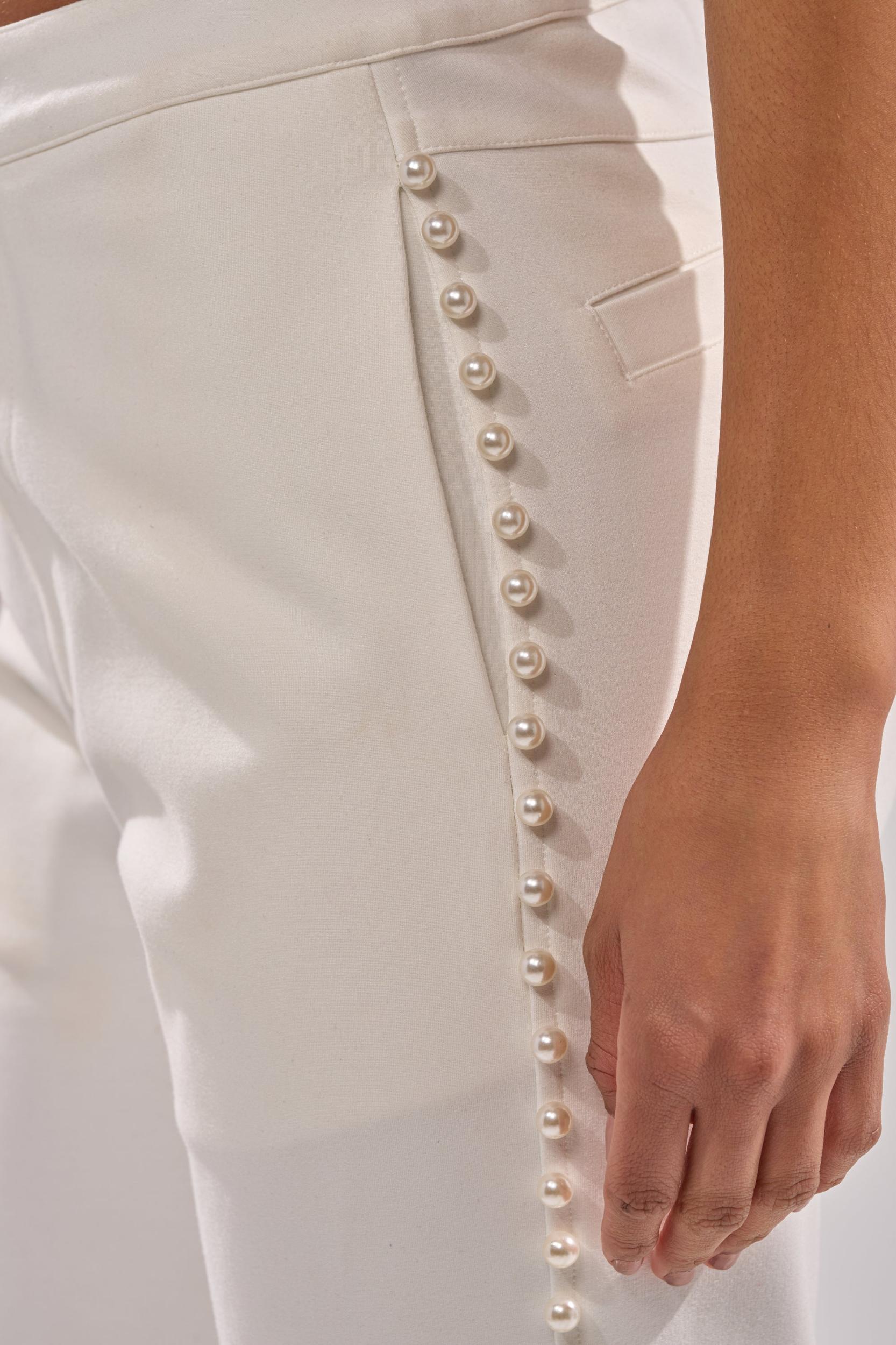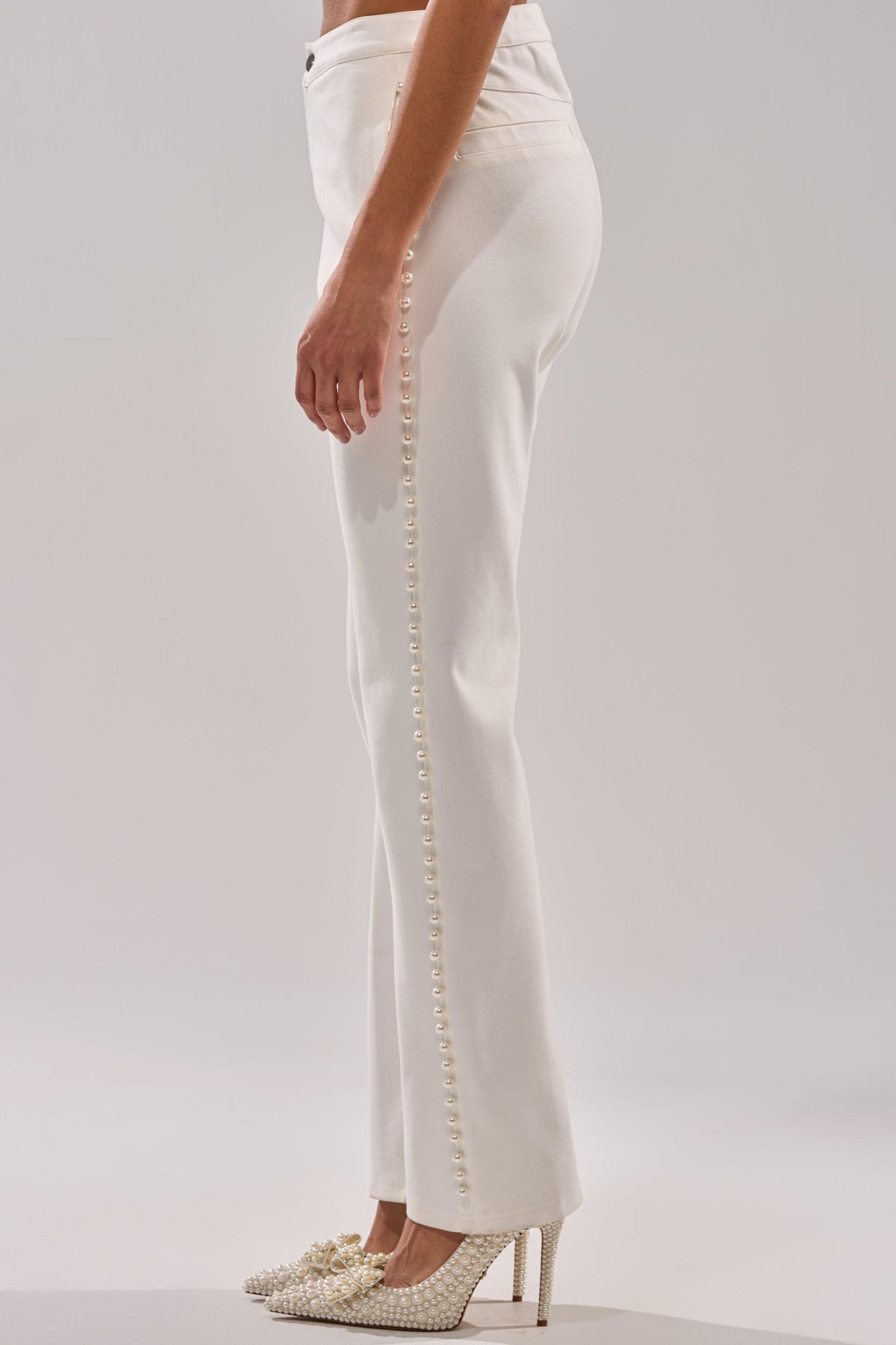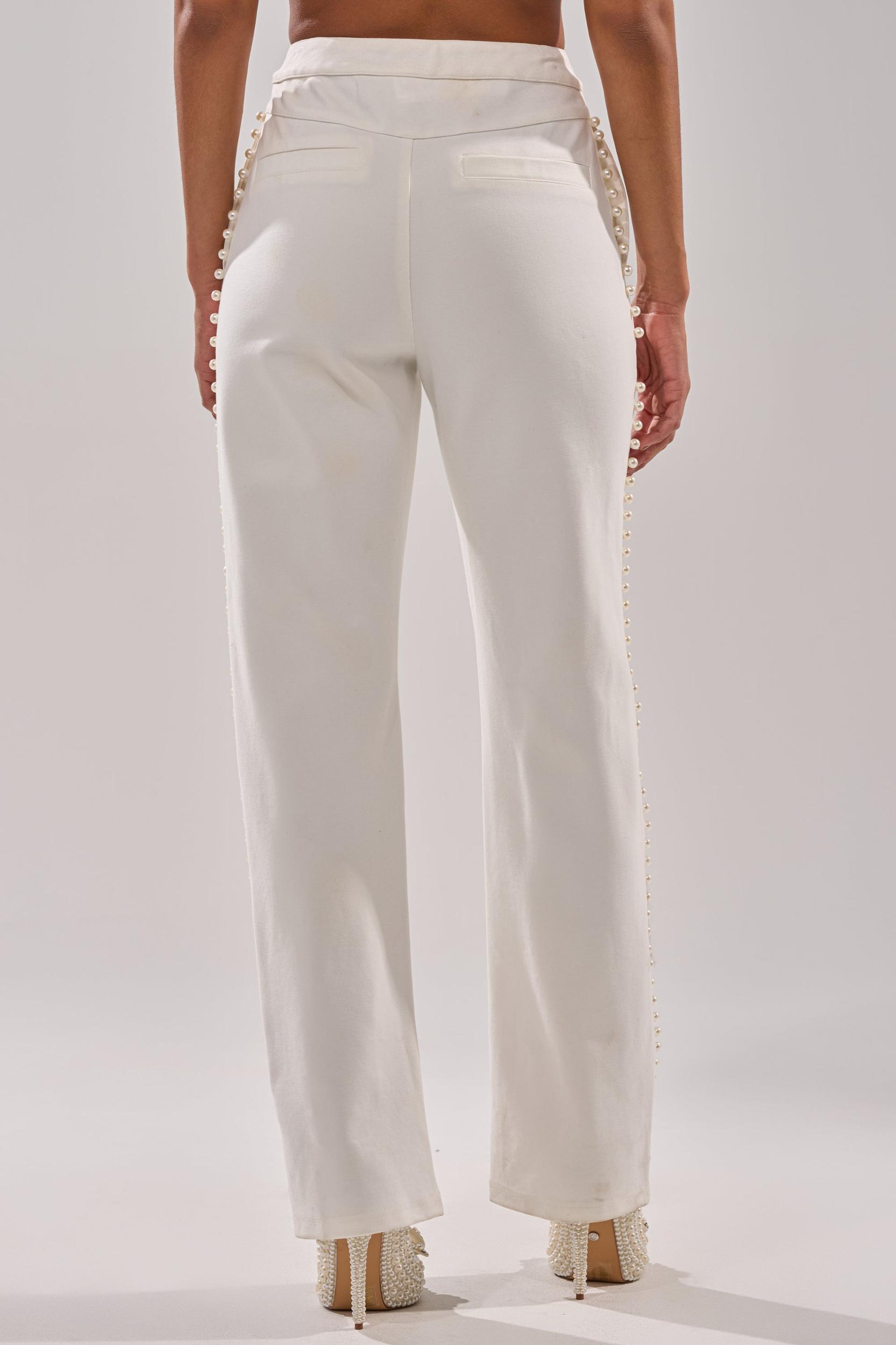 The AKIRA Label Chloe Pearl Trouser is absolute pearl-fection. Crafted from a sleek cotton fabric, this elegant bottom boasts a high-rise fit, a smoothing waistband, a four-pocket design, a button-zip front closure, and delicate faux pearl embellishments lining each side of the pant leg. Complete with a classic, straight-leg silhouette. Pair with the matching AKIRA Label Chloe Pearl Blazer, stiletto pumps, and a red lip for a bold finish. - 95% Cotton 5% Spandex- Hand Wash Cold- Slight Stretch- Imported (all measurements approximate from size small)- 12” Rise- 31” Inseam- Model is 5’9” and is wearing size smallProduct ID: 1070660