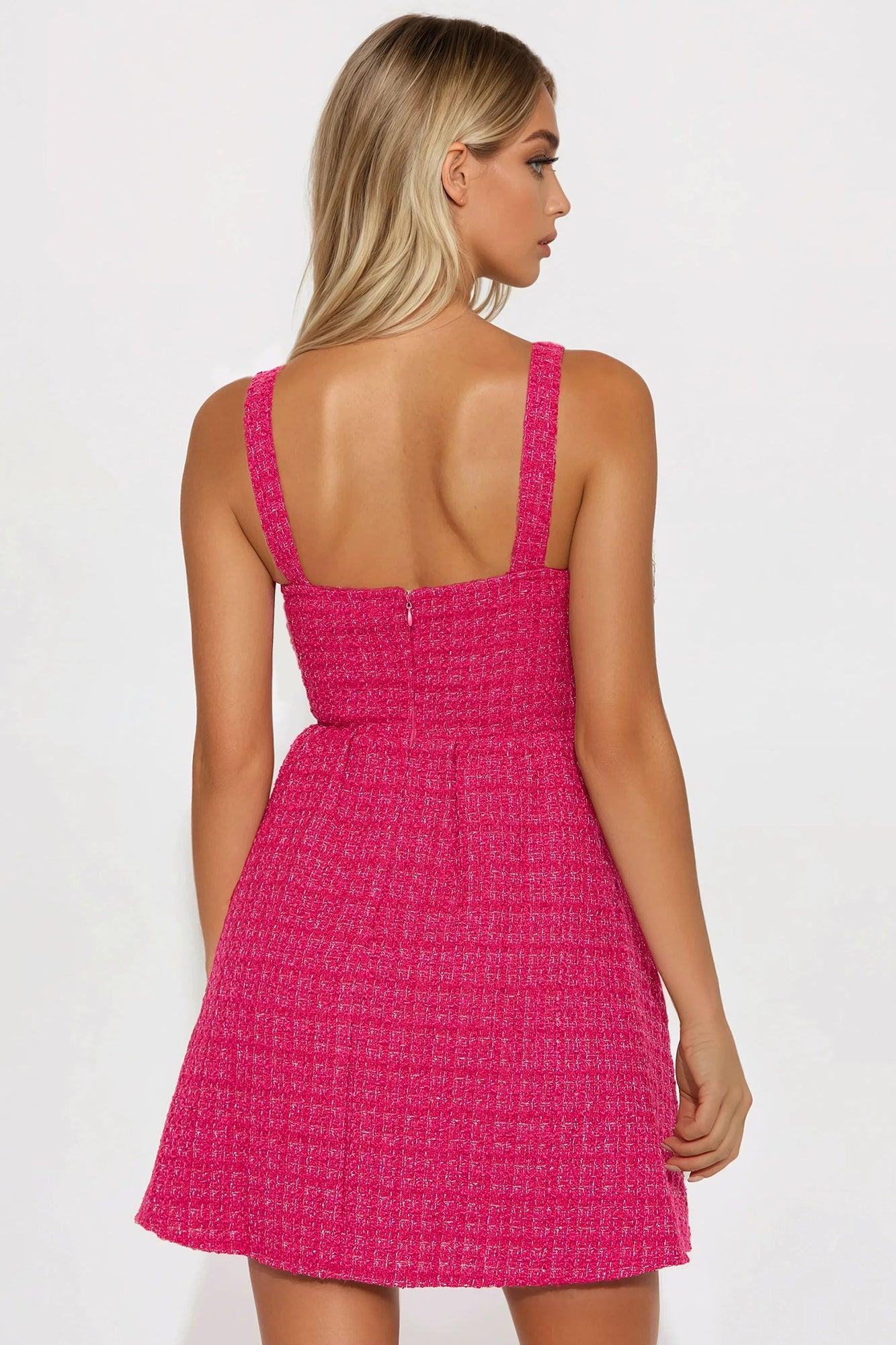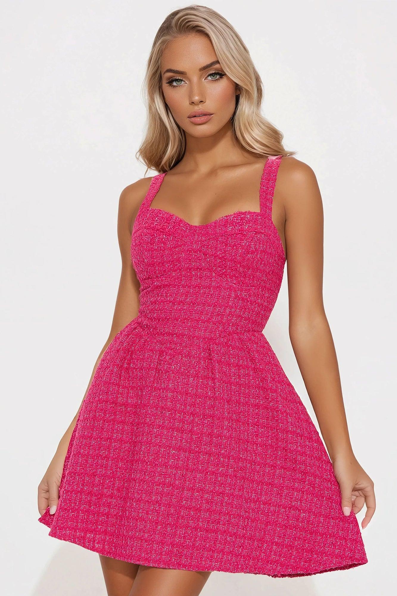 Available In Hot Pink. Tweed Mini Dress Sweetheart neckline Sleeveless Bra cups Back zipper Lined Stretch Length measured flat = 33" Self / Lining 100% Polyester Imported California Proposition 65WARNING: Cancer and Reproductive Harm - www.P65Warnings.ca.gov.