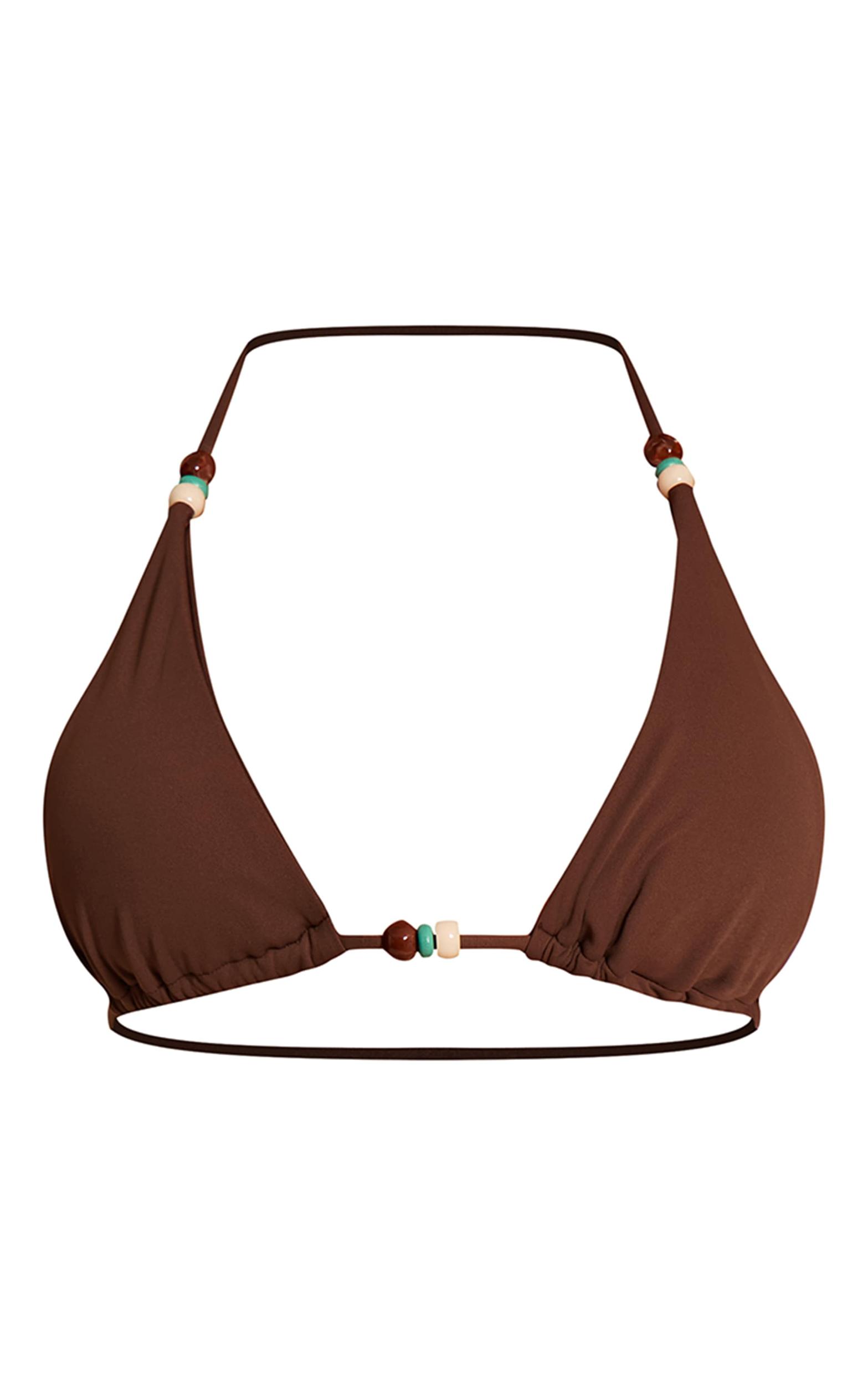 Opt for a classic silhouette with this chocolate bead trim detail triangle bikini top. Crafted from chocolate-toned material, this bikini top has a triangle style design and tie fastenings. Wear it with the matching bottoms, a crochet coverup and sandals for poolside perfection.Length approx 29cm/11.5inch (Based on sample size US 4)Model wears size UK 8/ EU 36/ AUS 8/ US 4Model Height - 5ft 8inchp]:!mb-4inch>Category: SwimwearProduct type: Triangle Bikini TopColor: BrownMaterial: SwimDesign: PlainOccasion: Day