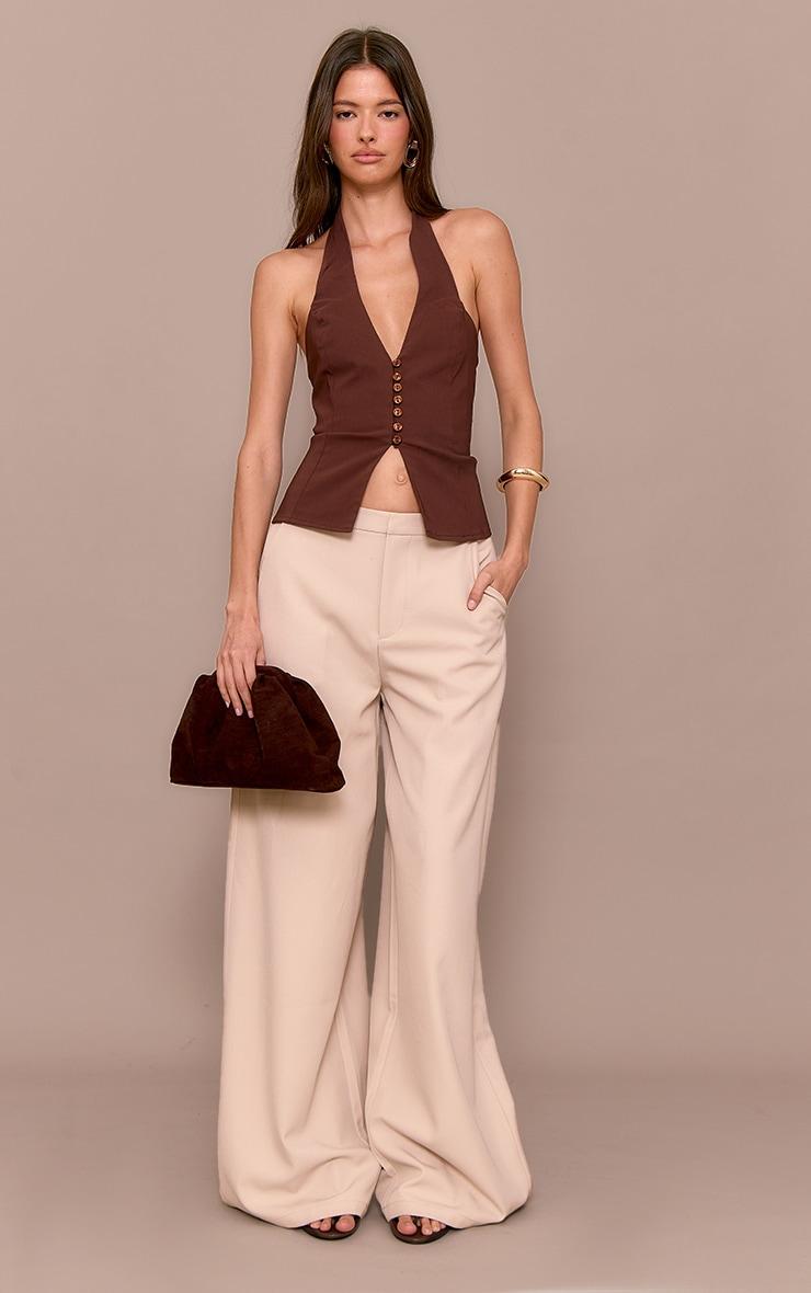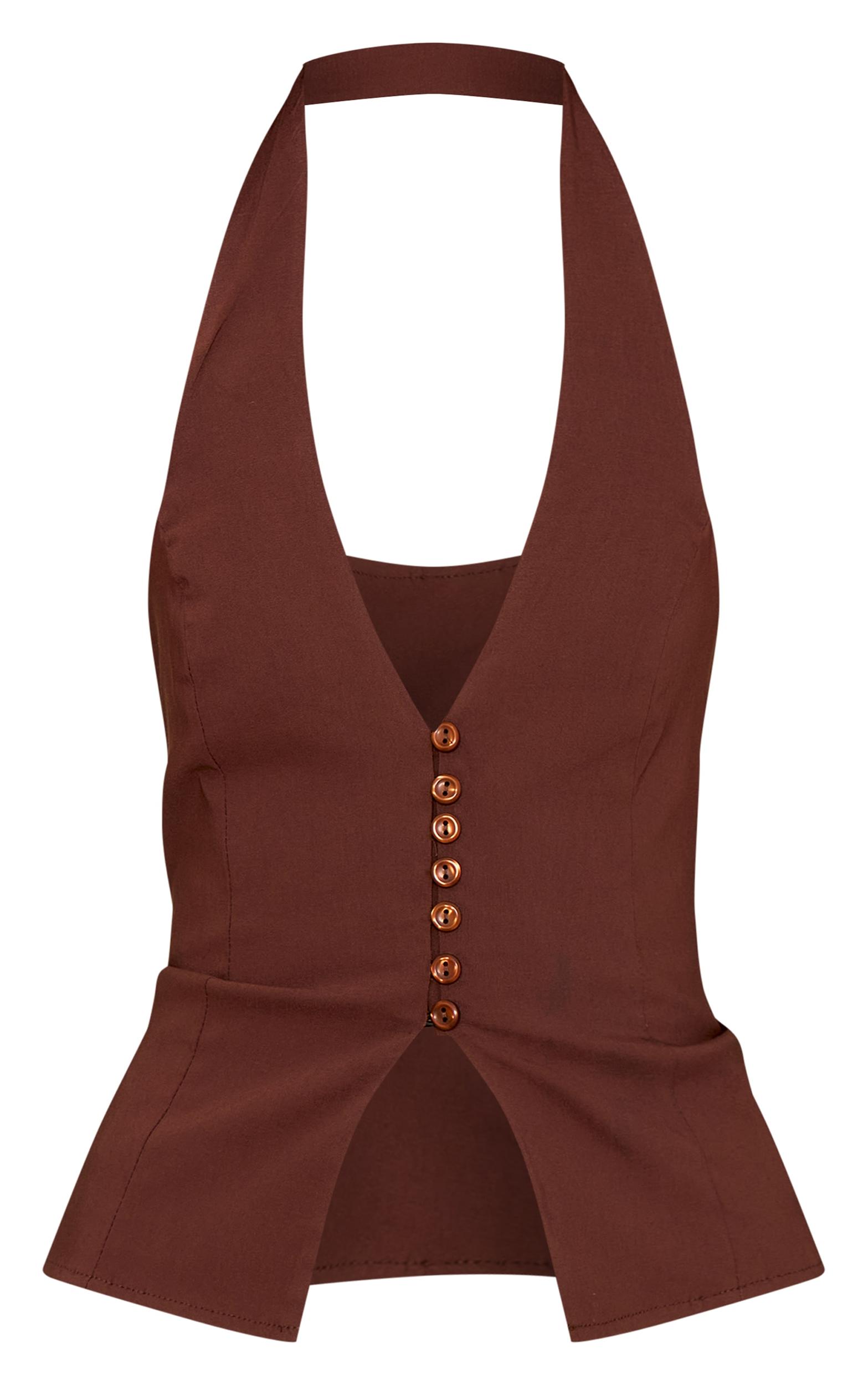 Turn heads in this chocolate bengaline button up halterneck long top. Brought to you in a chocolate bengaline material with a button up fastening and a halterneck design. Team this long top with wide leg pants and gold accessories for a chic finish.Length approx 48.5cm/19inch (Based on sample size US 4)Model wears size UK 8/ EU 36/ AUS 8/ US 4Model Height - 5ft 7inchp]:!mb-4inch>Category: TopsProduct type: Cami TopColor: ChocolateMaterial: BengalineDesign: PlainNeckline: HalterneckSleeves: SleevelessOccasion: Day