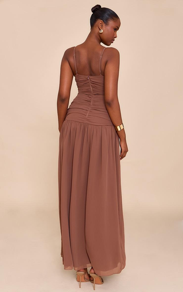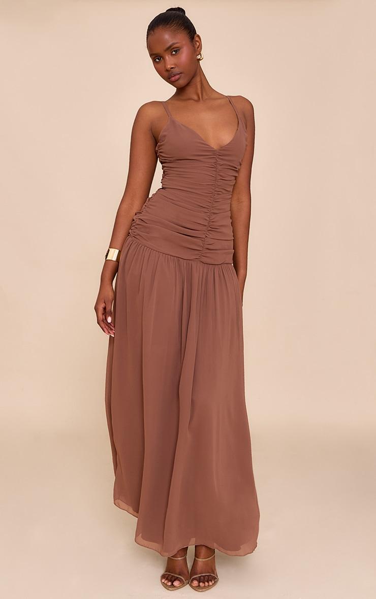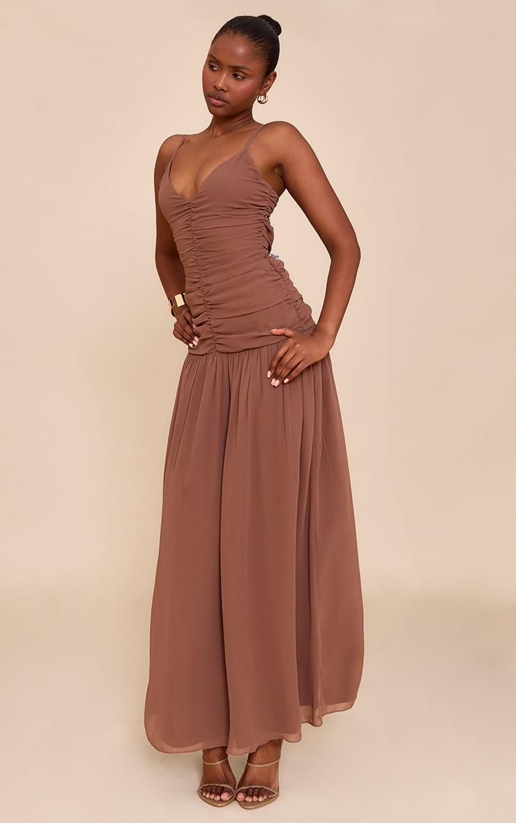 Effortless presence is served in deep chocolate. The chocolate chiffon ruched dropped waist maxi dress features fine spaghetti straps and a plunging V-neckline, leading into a ruched bodice that cinches the form. The waistline drops to a relaxed seam before the skirt falls to a sweeping maxi length, creating an artful silhouette. Style yours with strappy heels and finish with refined gold jewelry. Your occasion look is set.Length approx 155cm/61inch (Based on sample size US 4)Model wears size UK 8/ EU 36/ AUS 8/ US 4Model Height - 5ft 9inchp]:!mb-4inch>Brand: PrettyLittleThingCategory: DressesProduct type: Shift DressColor: ChocolateMaterial: ChiffonDesign: PlainNeckline: V NeckSleeves: Spaghetti StrapOccasion: Occasion