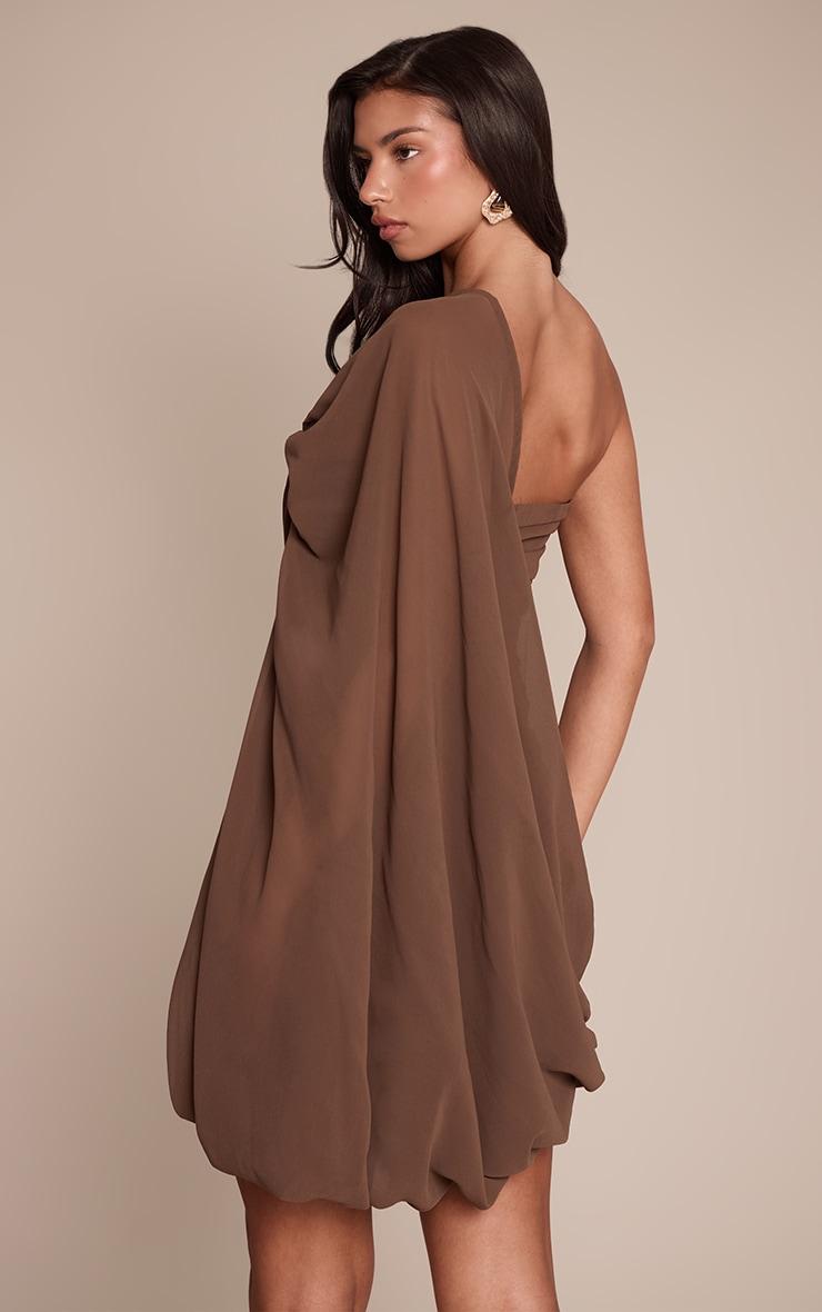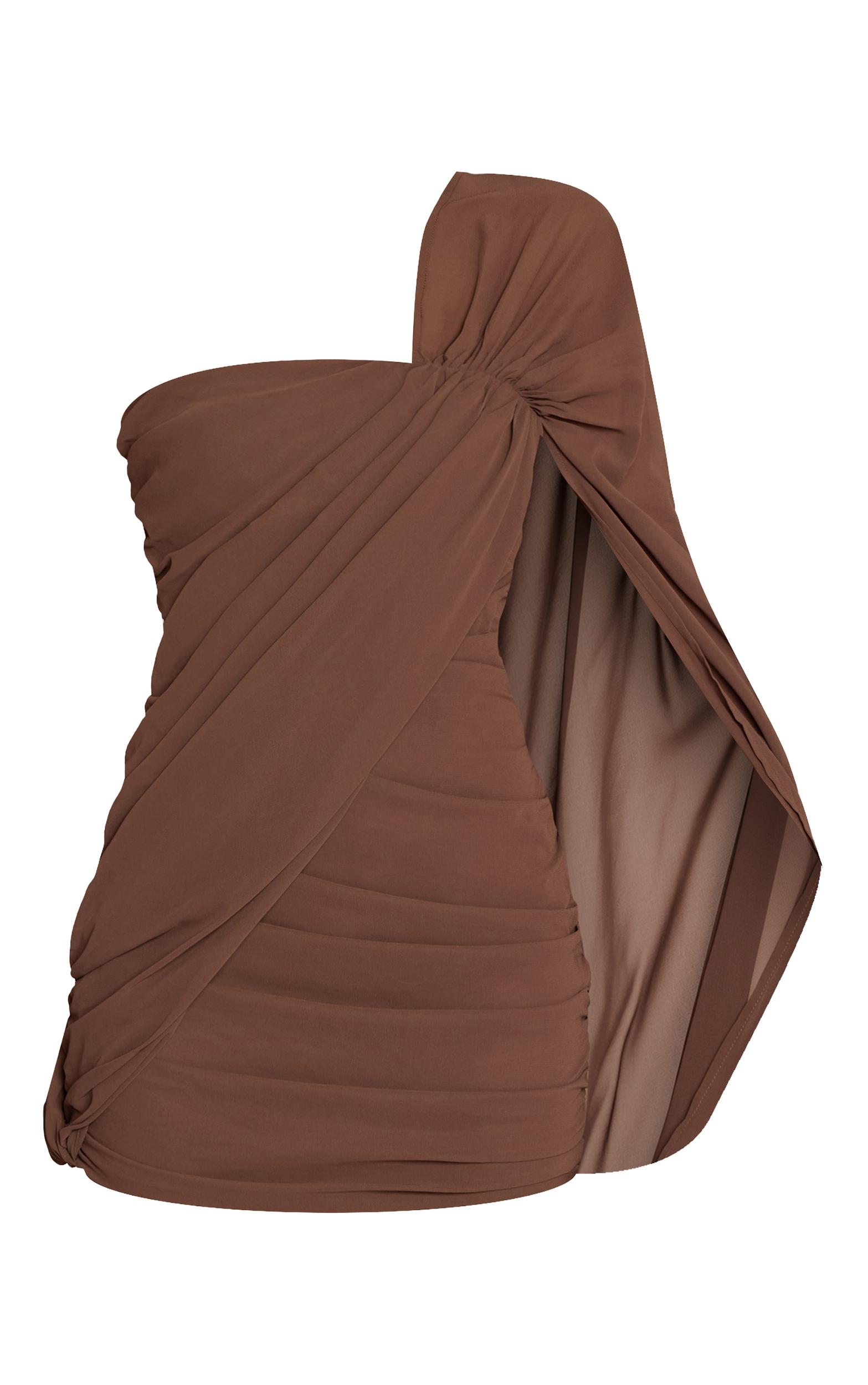 Make a lasting impression with the chocolate chiffon ruched one sleeve mini dress. Its rich chocolate chiffon forms an artful one-sleeve and ruched bodycon silhouette. Ideal for making a confident statement at any evening affair. Finish the look with elegant kitten heels and a chic gold ring.Length approx 81.5cm/32inch (Based on sample size US 4)Model wears size UK 8/ EU 36/ AUS 8/ US 4Model Height - 5ft 9inchp]:!mb-4inch>Brand: PrettyLittleThingCategory: DressesProduct type: Bodycon DressColor: ChocolateMaterial: ChiffonOccasion: Evening