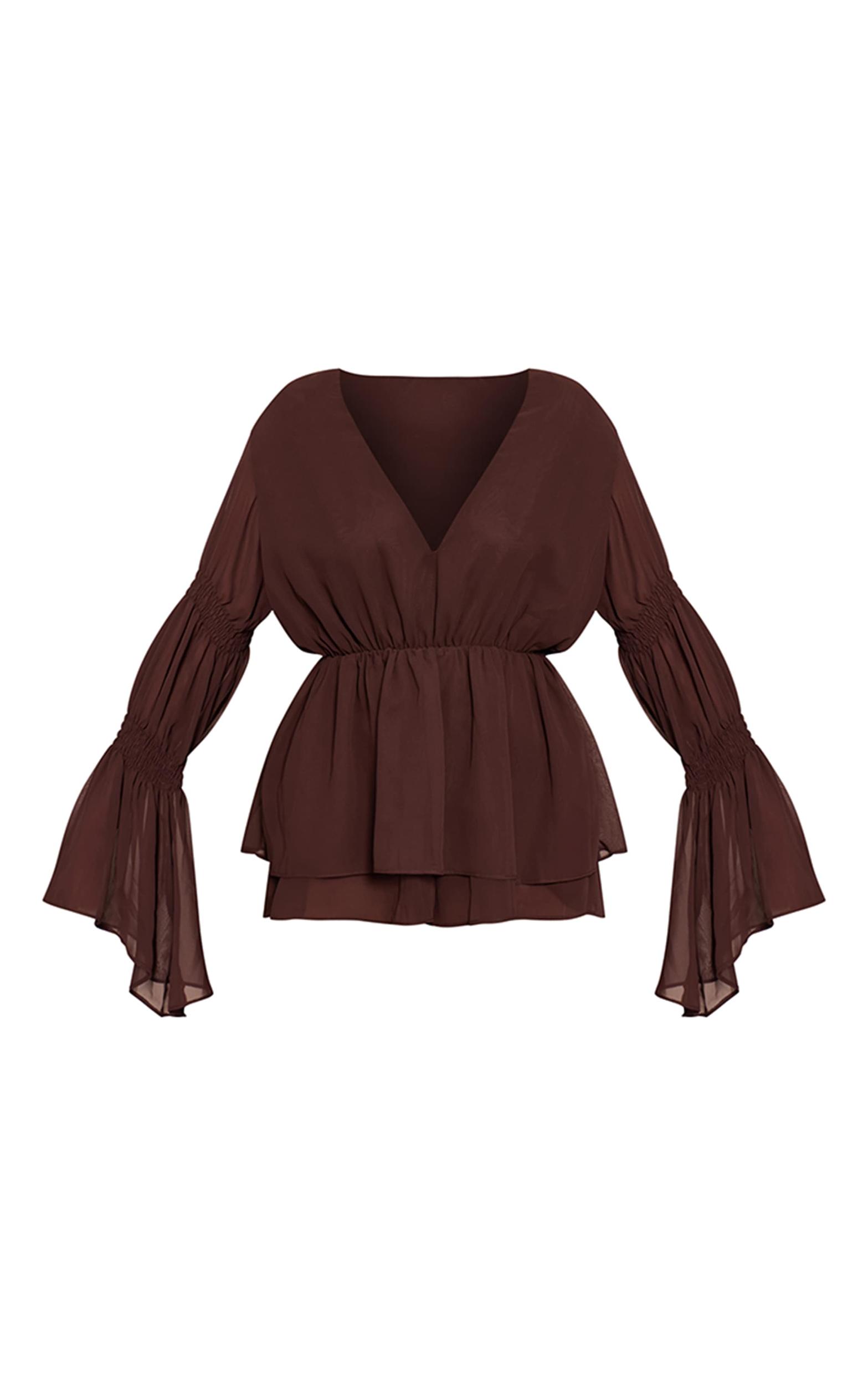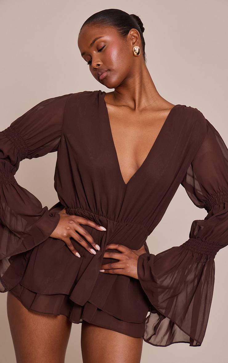 Effortlessly command attention with a silhouette designed for after-dark impact. This chocolate chiffon v neck long ruched sleeve romper blends a confident deep V-neckline with artfully voluminous long sleeves, featuring distinctive ruched detailing that culminates in dramatic flared cuffs. A cinched elasticated waist creates a refined shape, flowing into a tiered romper hem for an undeniable finish. Elevate this commanding piece with sleek high heels and a stack of gold cuff bracelets, ensuring your evening look is both polished and self-assured.Length approx 81.5cm/32inch (Based on sample size US 4)Model wears size UK 8/ EU 36/ AUS 8/ US 4Model Height - 5ft 9inchp]:!mb-4inch>Brand: PrettyLittleThingCategory: DressesProduct type: Floaty PlaysuitColor: ChocolateMaterial: Woven CrepeOccasion: Evening
