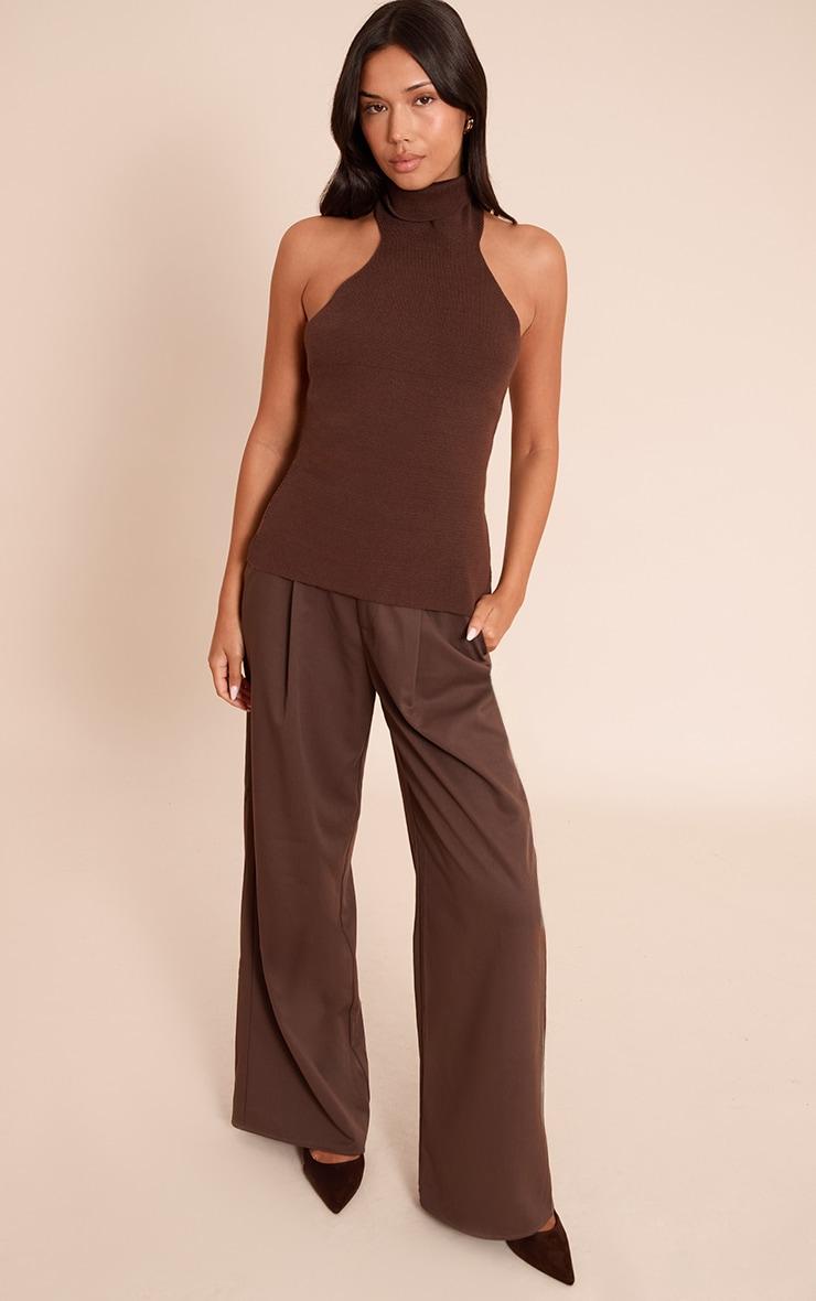 The chocolate compact knit halterneck top is a modern wardrobe staple. Cut in a fitted silhouette with a sleek halterneck design, it offers a clean, sculpted finish in a deep chocolate shade. Pair with wide-leg pants and heels for understated elegance, or wear under a blazer for a contemporary layered look.Length approx 48.5cm/19inch (Based on sample size S)Model wears size SModel Height - 5ft 9inchp]:!mb-4inch>Brand: PrettyLittleThingCategory: KnitwearProduct type: Vest TopColor: ChocolateMaterial: KnitNeckline: HalterneckSleeves: SleevelessOccasion: Day