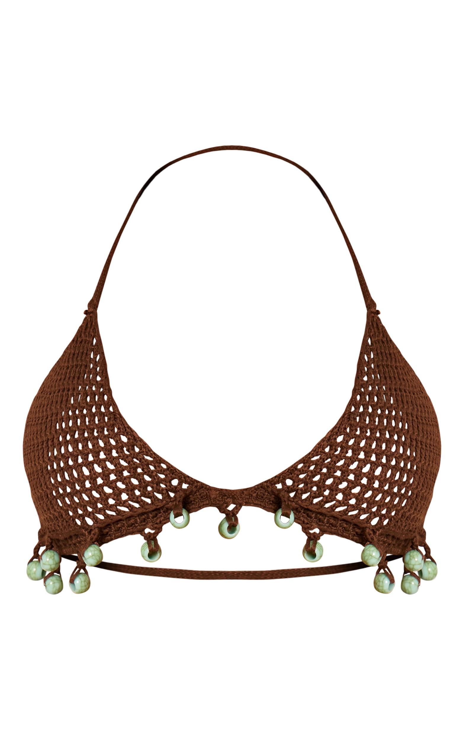Turn heads for all the right reasons in this chocolate crochet bead trim triangle bikini top. Made from brown crochet knit fabric, this top has tie fastenings, a triangle shape and elaborate bead trim detailing. Pair it with the matching shorts and sandals for a chic two piece set.Length approx 29cm/11.5inch (Based on sample size S)Model wears size SModel Height - 5ft 8inchp]:!mb-4inch>Category: SwimwearProduct type: Triangle Bikini TopColor: ChocolateMaterial: CrochetDesign: PlainOccasion: Day