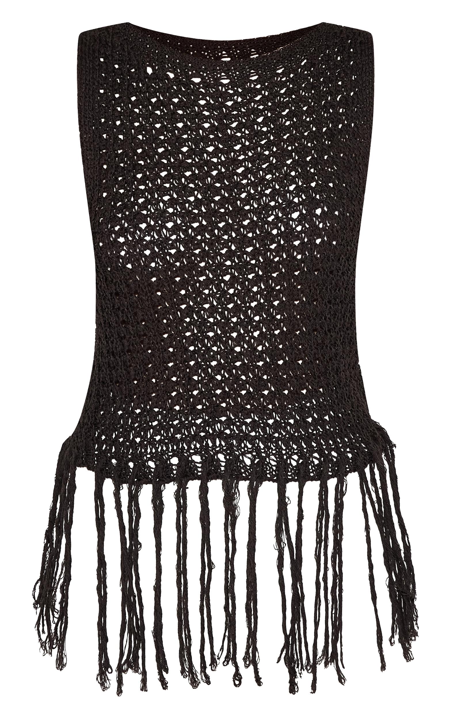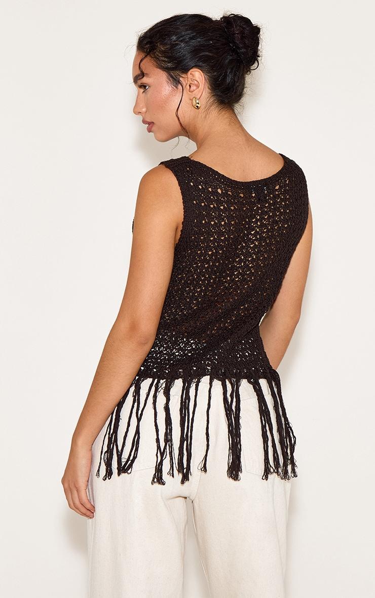 Add richness to your wardrobe with this chocolate crochet boat neck fringe top, a warm-toned twist on seasonal textures. Brought to you in chocolate crochet knit with a wide boat neckline and statement fringe hem, it’s effortless and bold. Wear with sandals and wide leg linen look pants for a chic finish like no other.Length approx 48.5cm/19inch (Based on sample size S)Model wears size SModel Height - 5ft 7inchp]:!mb-4inch>Category: KnitwearProduct type: Vest TopColor: ChocolateMaterial: KnitOccasion: Day