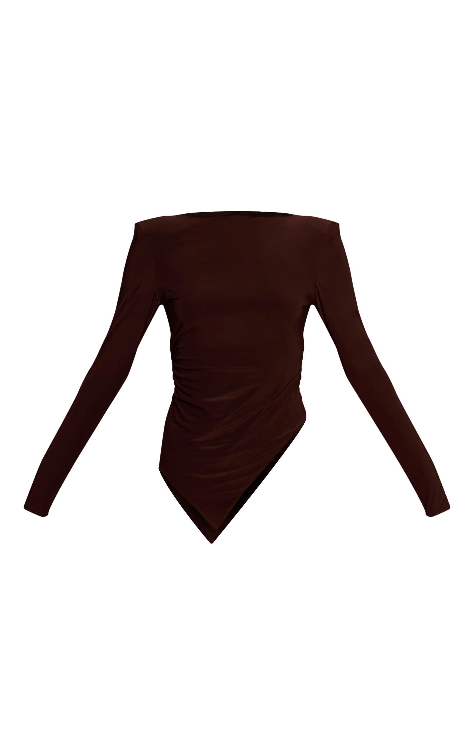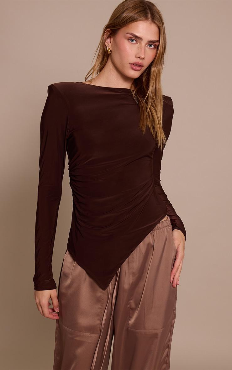 A study in contemporary form, the chocolate double layer slinky shoulder pad asymmetric top offers a fresh perspective on daywear. This rich chocolate piece features a refined wide boat neckline and long sleeves, with confidently structured shoulder pads creating a defined upper silhouette. Artful ruching flows into a distinctive asymmetric hemline, ensuring an impactful and considered finish. Pair this versatile top with tailored wide-leg pants for a polished ensemble, completing your look with sleek nude heels and subtle gold hoops for an aesthetic that's entirely your own.Length approx 48.5cm/19inch (Based on sample size US 4)Model wears size UK 8/ EU 36/ AUS 8/ US 4Model Height - 5ft 8inchp]:!mb-4inch>Brand: PrettyLittleThingCategory: TopsProduct type: Fitted T-ShirtColor: ChocolateMaterial: Slinky JerseyDesign: PlainNeckline: CrewSleeves: LongOccasion: Day