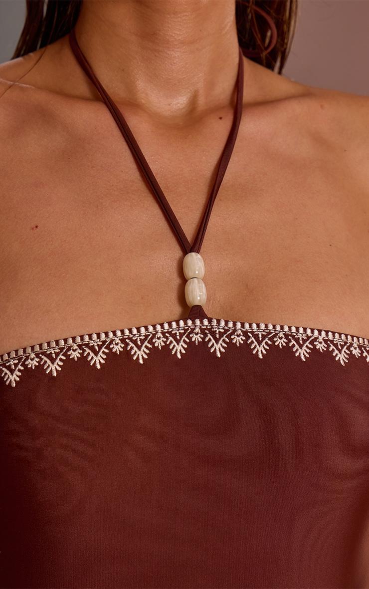 Make waves in the chocolate embroidered bead detail halter swimsuit. Made from a chocolate swim fabric, this swimsuit features intricate bead embroidery and a halterneck fit. Style with gold jewelry and slip-on heels for poolside glamour.Length approx 66cm/26inch (Based on sample size US 4)Model wears size UK 8/ EU 36/ AUS 8/ US 4Model Height - 5ft 6inchp]:!mb-4inch>Brand: PrettyLittleThingCategory: SwimwearProduct type: SwimsuitColor: ChocolateMaterial: SwimOccasion: Day