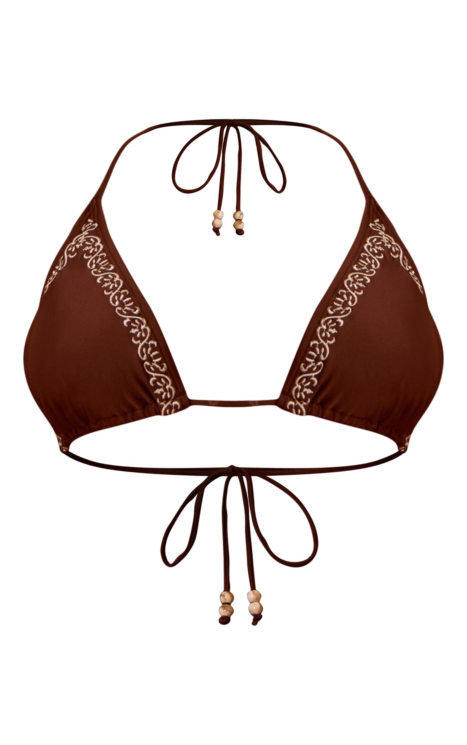 Keep it chic in this chocolate embroidered bead detail triangle bikini top. Made from brown material, this bikini top has bead detailing, tie fastenings and contrast embroidery. Pair it with the matching bottoms and sarong for a seasonal ensemble.Length approx 29cm/11.5inch (Based on sample size US 4)Model wears size UK 8/ EU 36/ AUS 8/ US 4Model Height - 5ft 6inchp]:!mb-4inch>Brand: PrettyLittleThingCategory: SwimwearProduct type: Triangle Bikini TopColor: ChocolateMaterial: SwimOccasion: Day