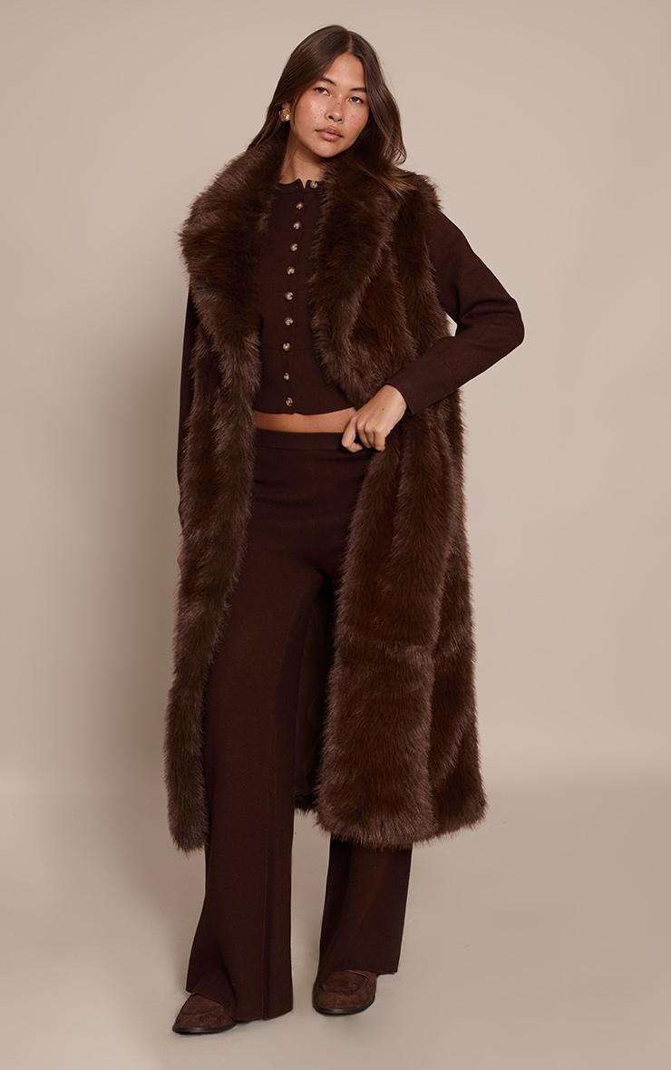 Layer up in style with this chocolate faux fur maxi vest. Brought to you in a chocolate faux fur material with a maxi length fit for ultimate cosy look. Wear over knitwear and knsome comfy sneakers to complete the look.Length approx 134.5cm/53inch (Based on sample size S)Model wears size SModel Height - 5ft 9inchp]:!mb-4inch>Category: OuterwearProduct type: VestColor: ChocolateMaterial: Faux FurOccasion: Day