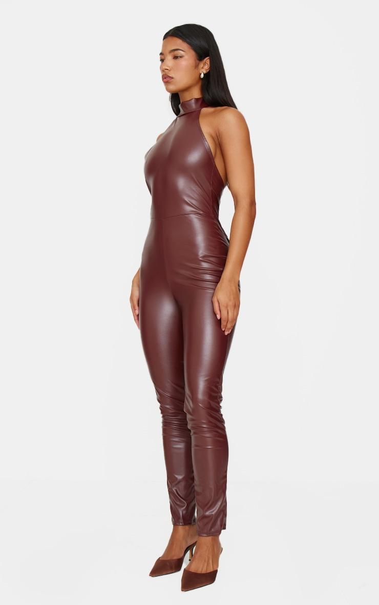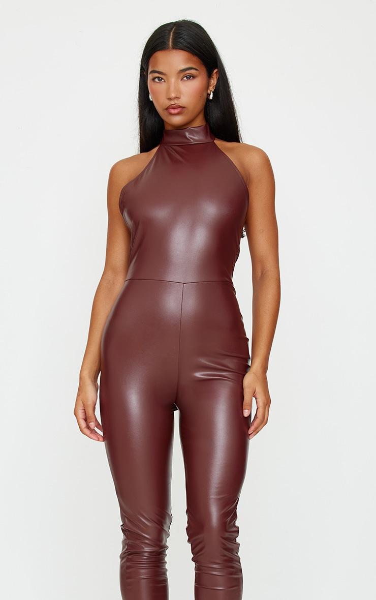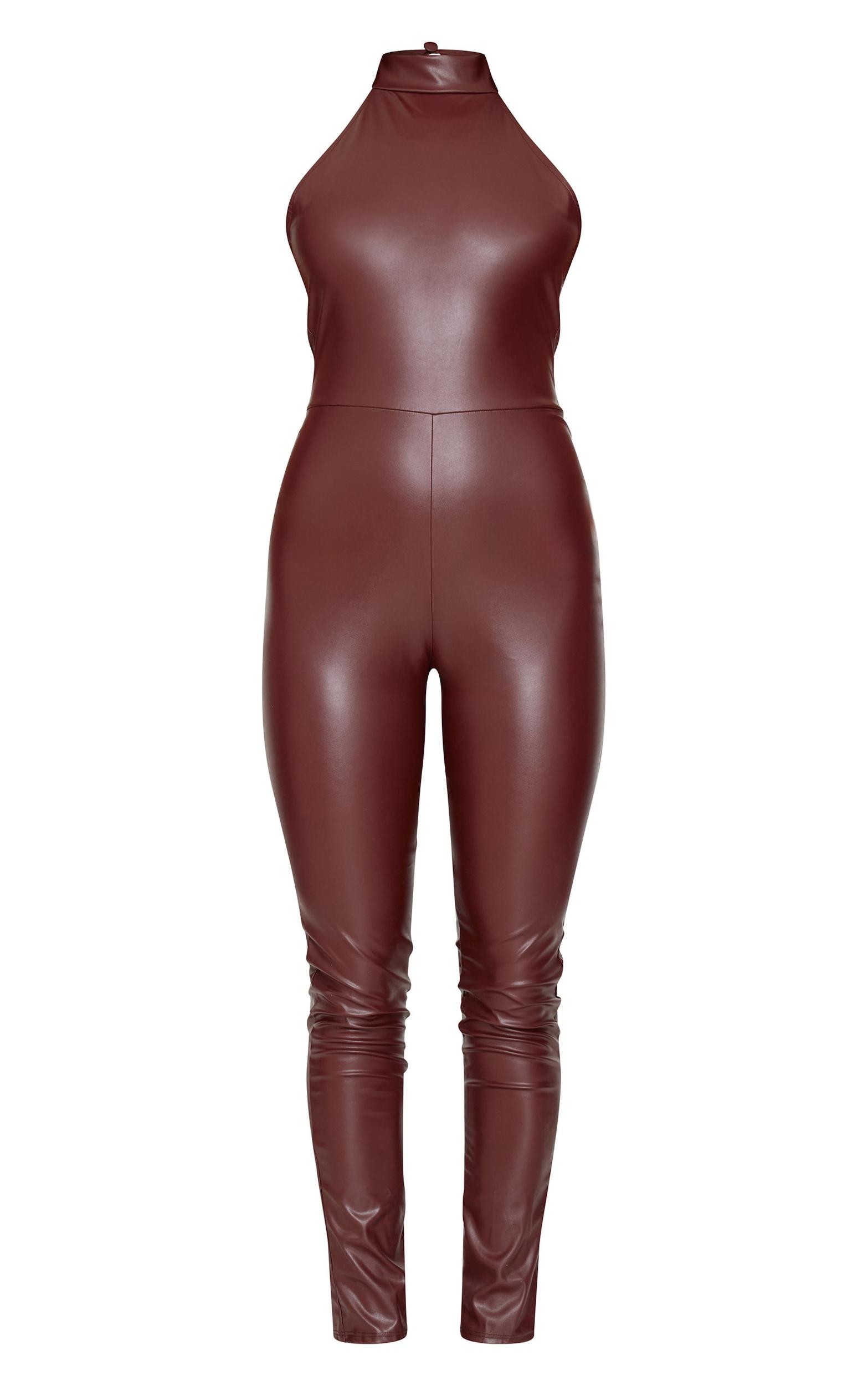 Make a statement with this chocolate faux leather halterneck back tie straight leg jumpsuit. Brought to you in a chocolate hue, with a luxe faux leather material, halterneck design and a back tie detail, how can you resist? Style with a pair of brown heels and silver accessories for a chic finish. Length approx 135cm/53inch (Based on a sample size UK 8) Model wears size UK 8/ EU 36/ AUS 8/ US 4Model Height - 5ft 6inchp]:!mb-0inch>Category: Jumpsuits & PlaysuitsProduct type: Skinny JumpsuitColor: Chocolate.Material: Faux LeatherDesign: PlainNeckline: HalterneckOccasion: Evening
