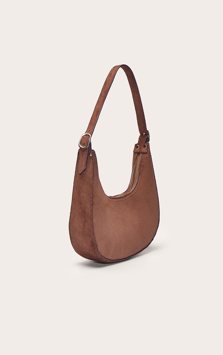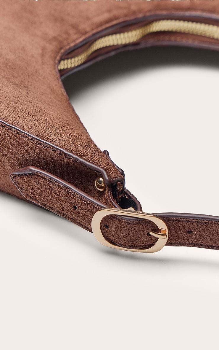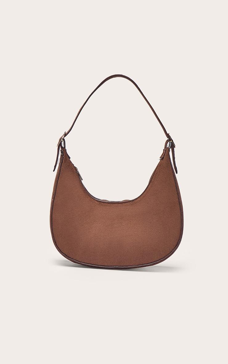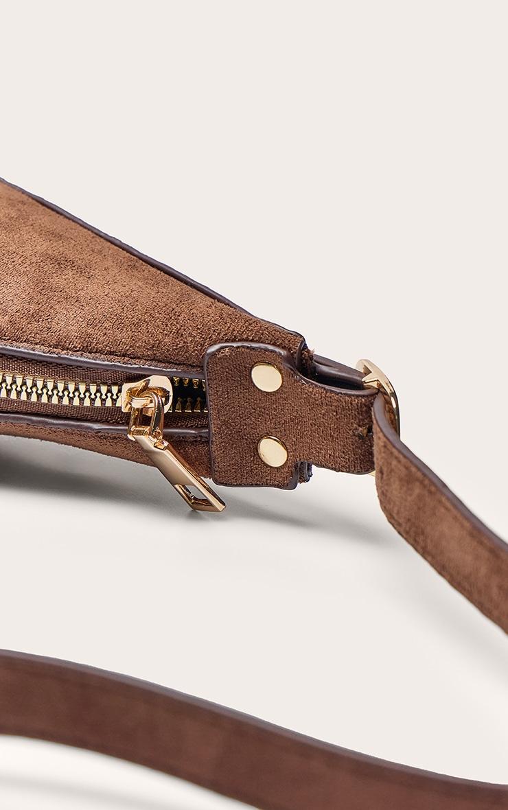 Some pieces simply complete the look. The chocolate faux suede curved shoulder bag, with its unique crescent shape and rich chocolate hue, is designed to refine your after-dark presence. Featuring a sleek top zip fastening and a slender shoulder strap, this piece offers a refined silhouette that’s both modern and effortless. Pair it with a sharp tailored jumpsuit or a sophisticated midi dress and stiletto heels for an assured evening aesthetic. Approx Height: 16cm/6.5inch Approx Width: 25.5cm/10inch Approx Depth: 7.5cm/3inchp]:!mb-4inch>Brand: PrettyLittleThingCategory: AccessoriesProduct type: Shoulder BagColor: ChocolateMaterial: Faux SuedeOccasion: Evening