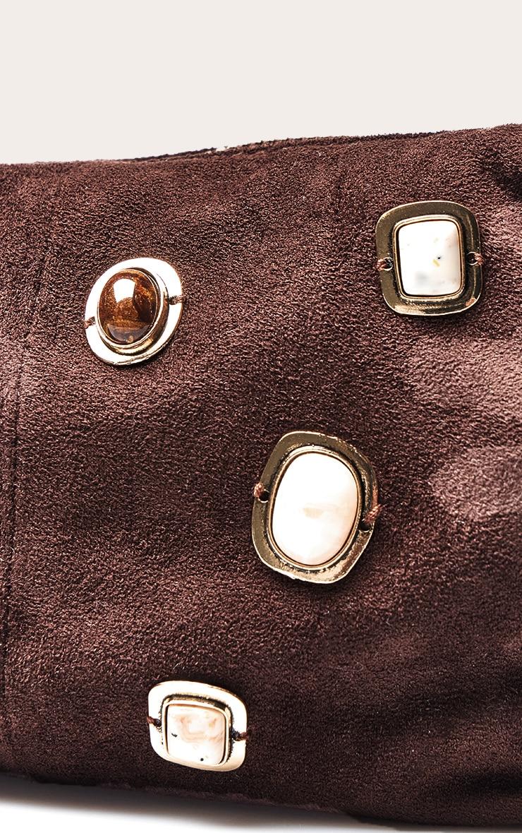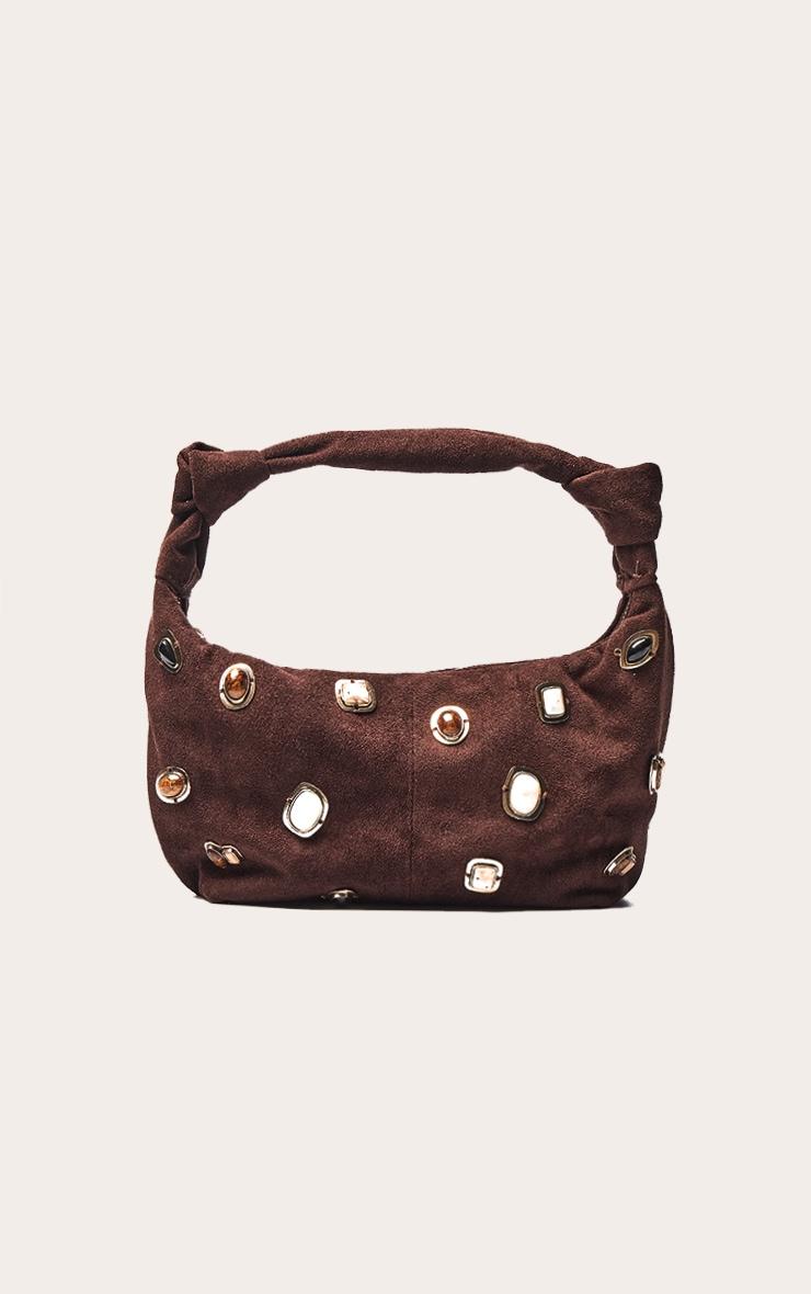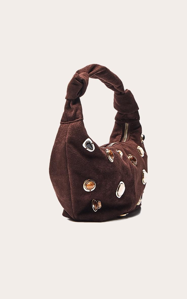 The chocolate faux suede dome stud shoulder bag is an everyday essential with a statement edge. Crafted in soft faux suede, this structured design is adorned with metallic dome studs that add a hint of attitude while keeping things chic. The shoulder strap makes it both stylish and functional. Perfect with leather pants and a knit top for a polished day look, or pair with a blazer dress and ankle boots for evening edge. Approx Height: 9cm/3.5inch Approx Width: 19cm/7.5inch Approx Depth: 4cm/1.5inchp]:!mb-4inch>Brand: PrettyLittleThingCategory: AccessoriesProduct type: Shoulder BagColor: ChocolateMaterial: Faux SuedeOccasion: Day