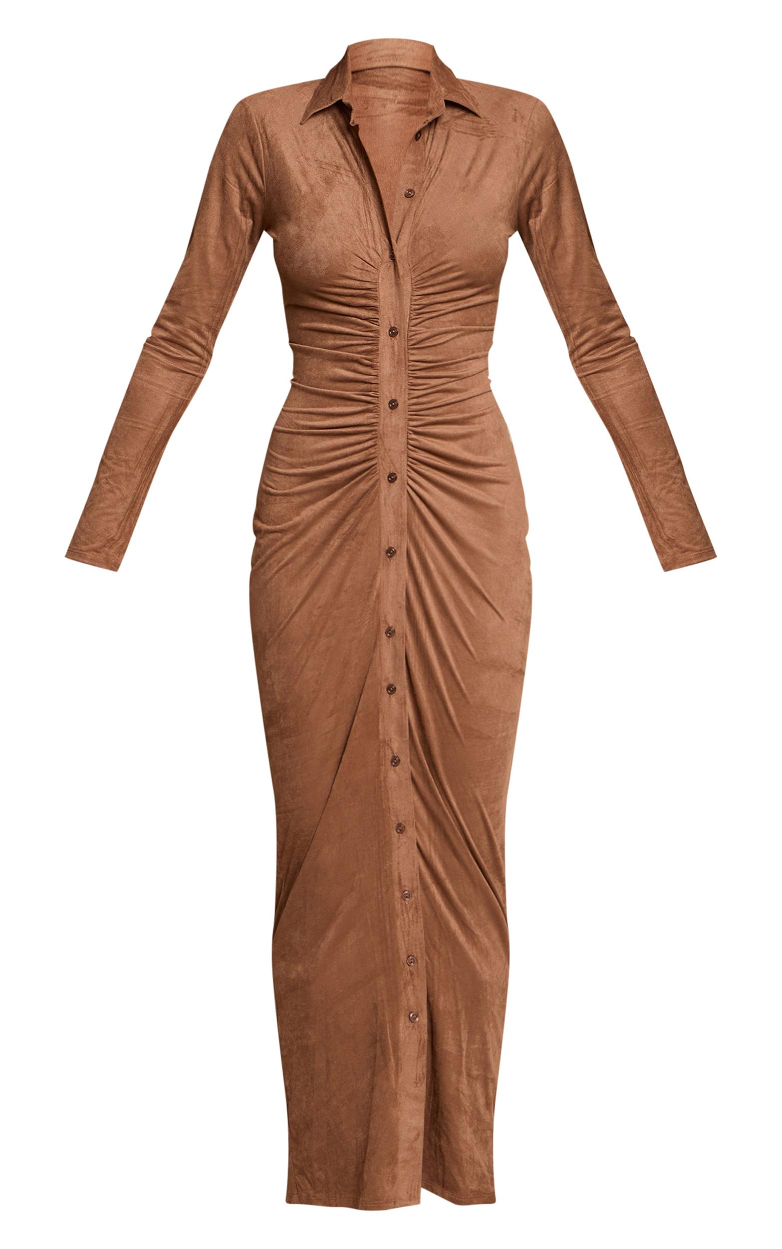 Curate a confident silhouette with the chocolate faux suede long sleeve ruched button up maxi dress. This bodycon maxi dress, in a chocolate faux suede, features a chic collared neckline, full button-up front, and flattering ruched detailing. It’s an indispensable piece for those elevated daily engagements or smart casual brunches. Complete this refined look with sleek black boots and delicate gold bracelets.Length approx 155cm/61inch (Based on sample size US 4)Model wears size UK 8/ EU 36/ AUS 8/ US 4Model Height - 5ft 9inchp]:!mb-4inch>Brand: PrettyLittleThingCategory: DressesProduct type: Bodycon DressColor: ChocolateMaterial: Faux SuedeSleeves: LongOccasion: Day