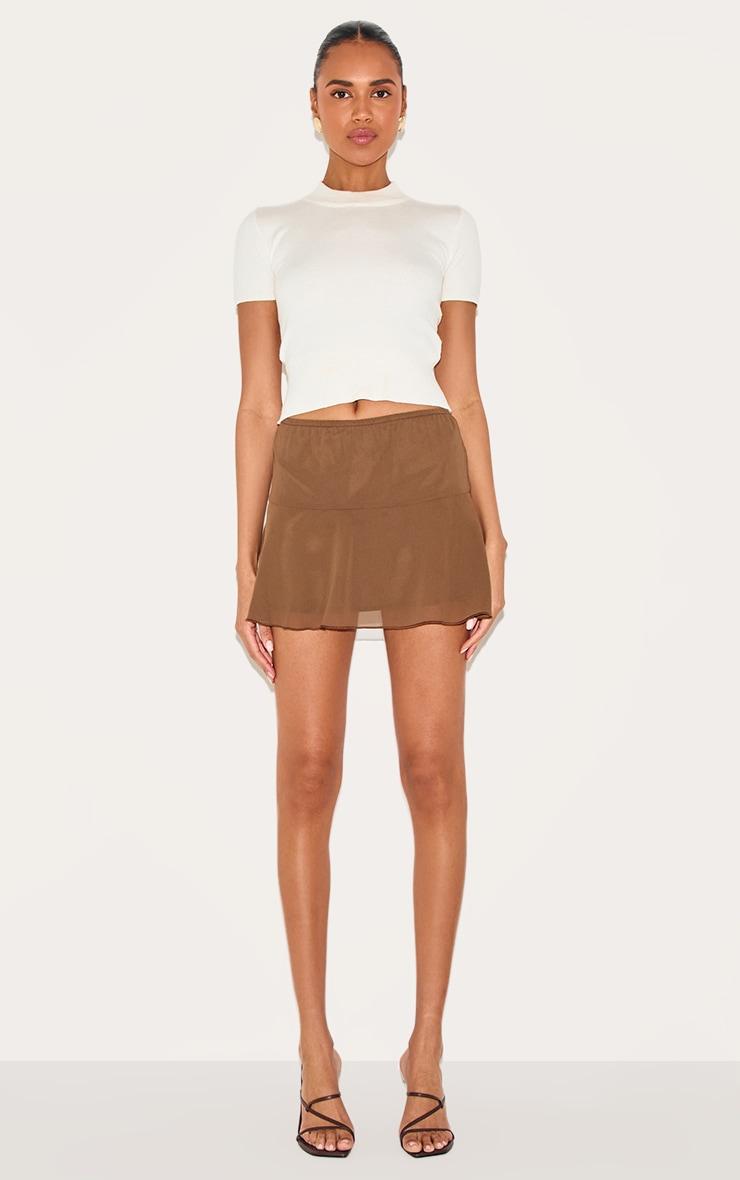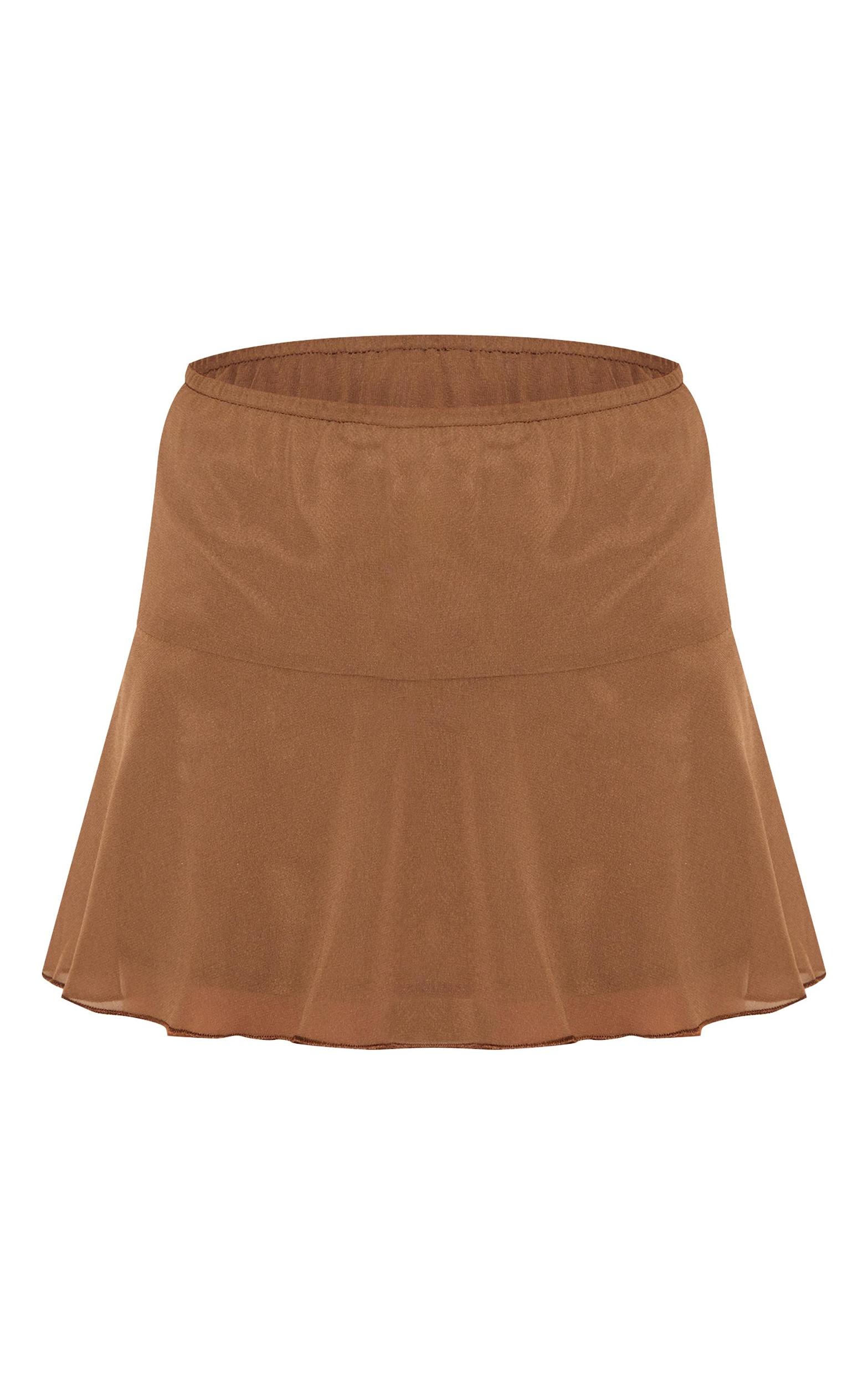 Made from a chocolate hue material with a frill hem design and a mini length.Length approx 33cm/13inch (Based on sample size US 4)Model wears size UK 8/ EU 36/ AUS 8/ US 4Model Height - 5ft 9inchp]:!mb-4inch>Category: BottomsProduct type: Mini SkirtColor: ChocolateMaterial: ChiffonDesign: PrintOccasion: Day