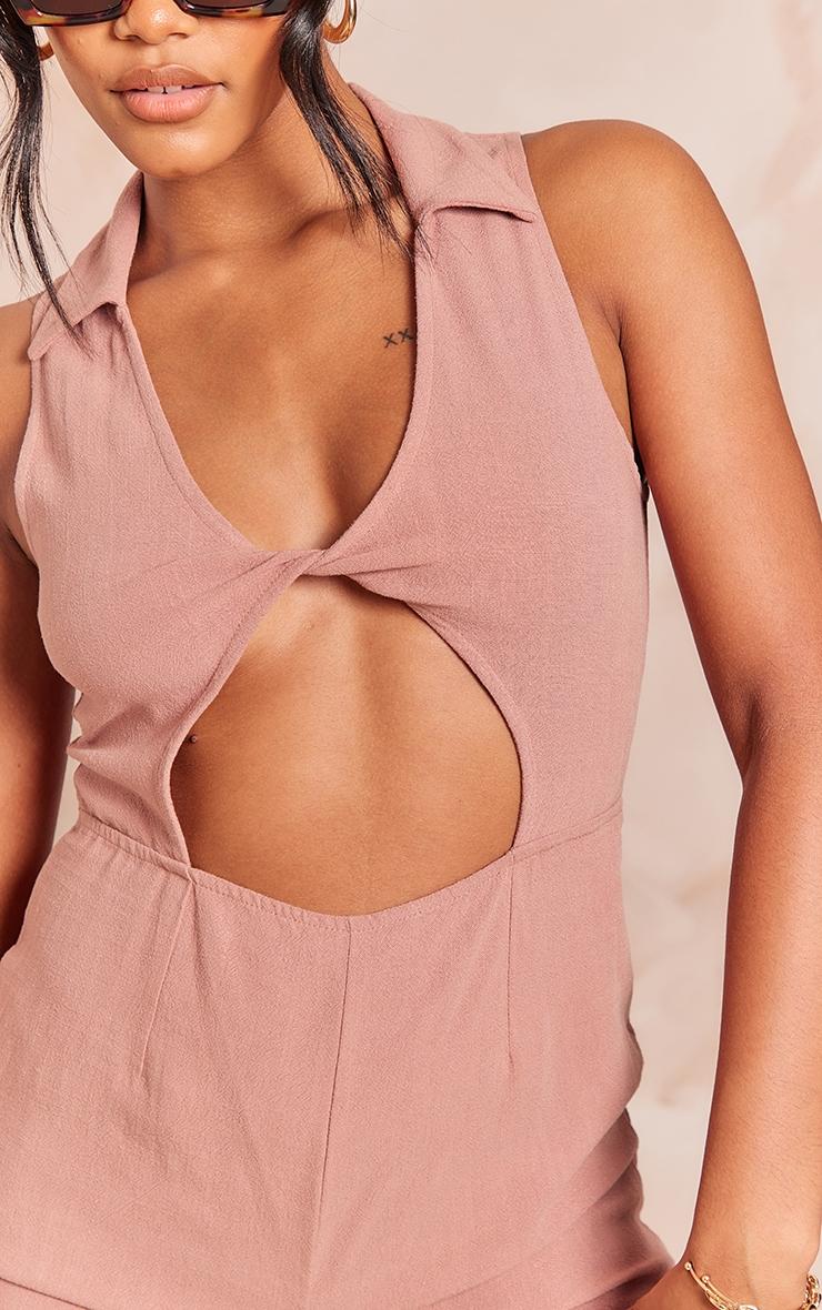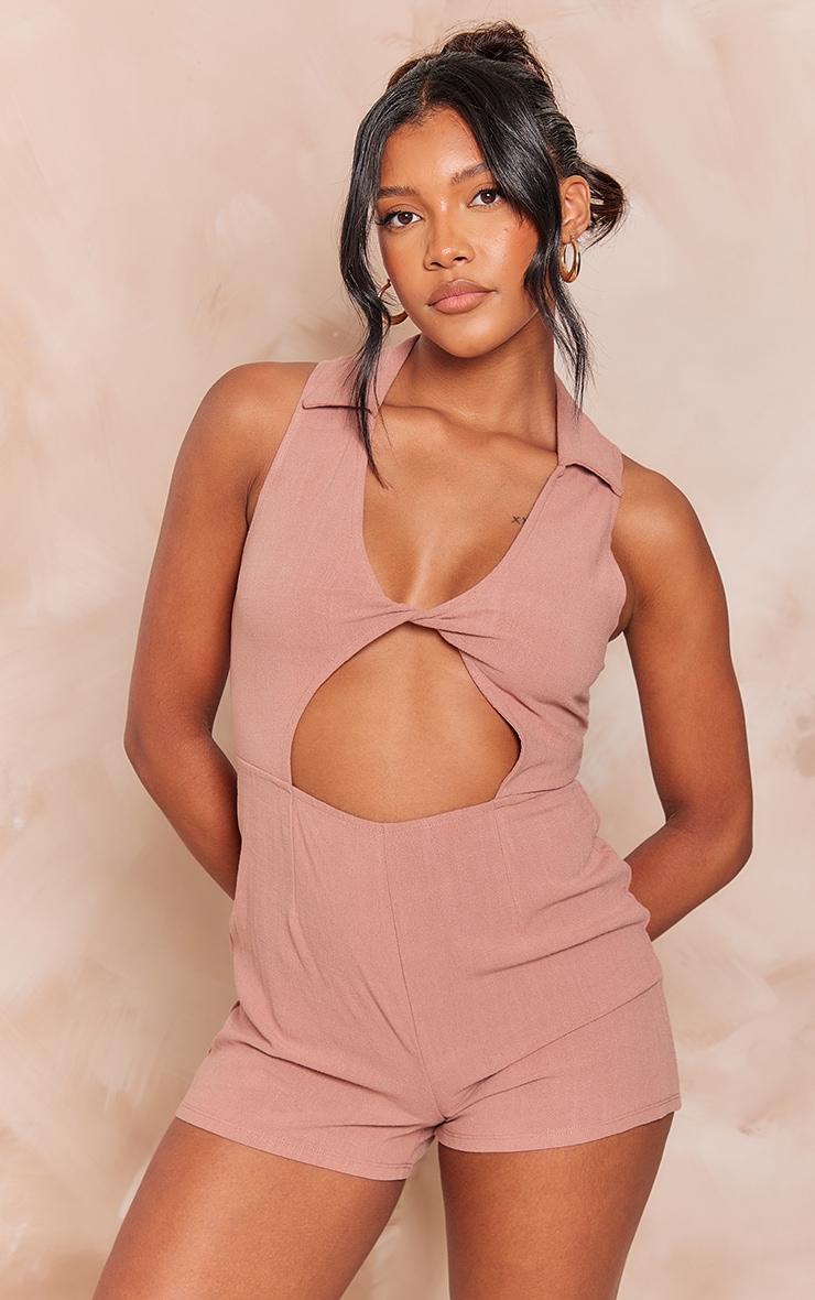 Take your vacay look to a whole new level with this chocolate linen look twist cut out collar detail romper. This romper is brought to you in a chocolate linen look material with a twist front and a cut out design, what more could you want? This romper is here to have you looking totally on-point this new season. Pair effortlessly with sandals and accessories for a look that we can't stop crushing on. Length approx 79cm/31inch (Based on a sample size UK 8) Model wears size UK 8/ EU 36/ AUS 8/ US 4Model Height - 5ft 7inchp]:!mb-4inch>Category: DressesProduct type: Floaty PlaysuitColor: ChocolateMaterial: Woven CrepeOccasion: Day