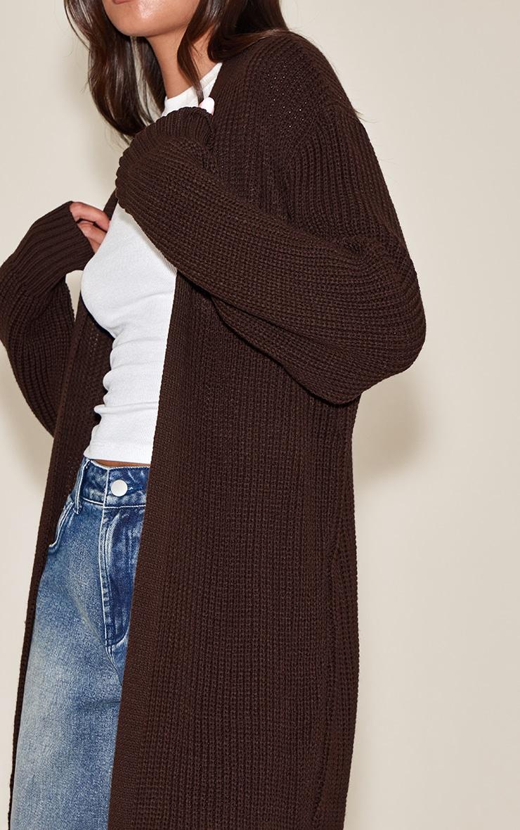 Cozy up in the chocolate maxi style knitted cardigan. Crafted from soft, chunky knit, this longline cardigan offers full coverage and relaxed elegance. Layer over dresses, jeans, or loungewear and finish with ankle boots or sneakers.Length approx 155cm/61inch (Based on sample size S)Model wears size SModel Height - 5ft 7inchp]:!mb-4inch>Category: KnitwearProduct type: CardigansColor: ChocolateMaterial: KnitOccasion: Day