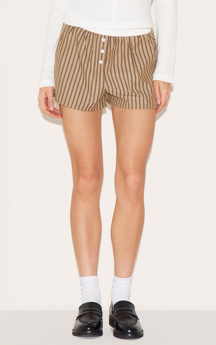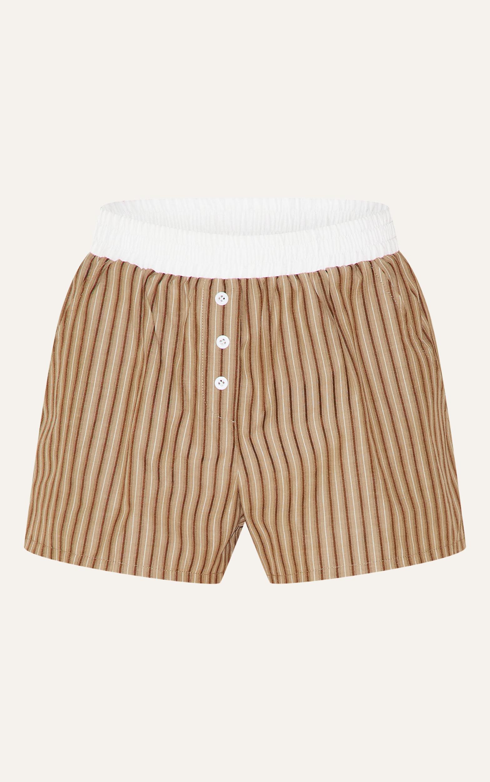 Presenting your new staple with these chocolate pinstripe cotton poplin contrast waistband shorts. Built for both comfort and style, these shorts have a fashion-forward contrast waistband detail and a flowy design. For a finish that will turn heads this season, team these shorts with a basic white button up top, loafers and your favorite delicate gold jewelry. Length approx 33cm/13inch (Based on sample size US 4)Model wears size UK 8/ EU 36/ AUS 8/ US 4Model Height - 5ft 8inchp]:!mb-4inch>Brand: PrettyLittleThingCategory: BottomsProduct type: FloatyColor: ChocolateMaterial: Cotton PoplinDesign: PrintOccasion: Day