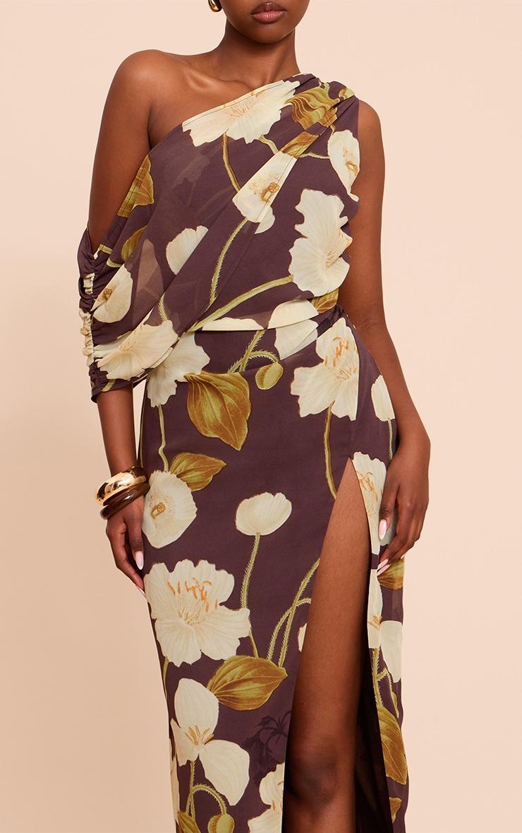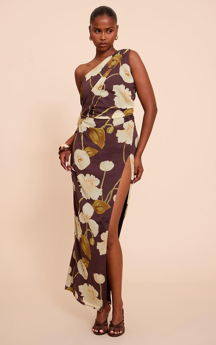 Capture attention effortlessly in the chocolate printed chiffon drape detail maxi dress, cut with a modern one-shoulder neckline and featuring an elegant all-over print. Its artful drape across the bodice shapes a striking profile, while the maxi length and daring thigh split define its confident appeal. Pair this distinctive design with barely-there heels and a sleek clutch bag, adding a single cuff bracelet and delicate gold hoops for an evening look that speaks volumes.Length approx 155cm/61inch (Based on sample size US 4)Model wears size UK 8/ EU 36/ AUS 8/ US 4Model Height - 5ft 9inchp]:!mb-4inch>Brand: PrettyLittleThingCategory: DressesProduct type: Shirt DressColor: ChocolateMaterial: Textured JerseyDesign: PrintNeckline: AsymmetricSleeves: ShortOccasion: Evening