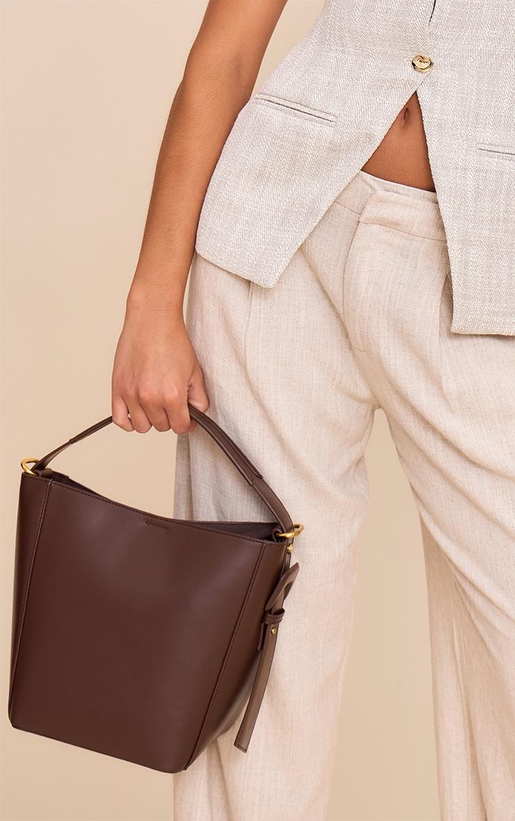 Make a subtle statement that effortlessly elevates your everyday. The chocolate pu buckle strap bucket bag offers a sleek, structured silhouette, complete with a refined top handle and distinctive gold-tone hardware. This versatile piece, finished with an artful side tie detail, provides ample space for your essentials while maintaining a polished line. Perfect for a curated day ensemble, style yours with a crisp white shirt and tailored pants, or pair with a minimalist midi dress and sleek flat sandals for a knowing, put-together look that transitions seamlessly from office to brunch. Approx Height: 33cm/13inch Approx Width: 30cm/12inch Approx Depth: 2.5cm/1inchp]:!mb-4inch>Brand: PrettyLittleThingCategory: AccessoriesProduct type: ToteColor: ChocolateOccasion: Day