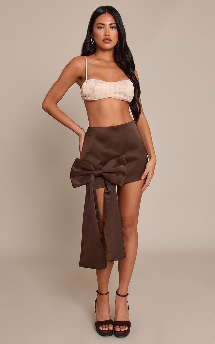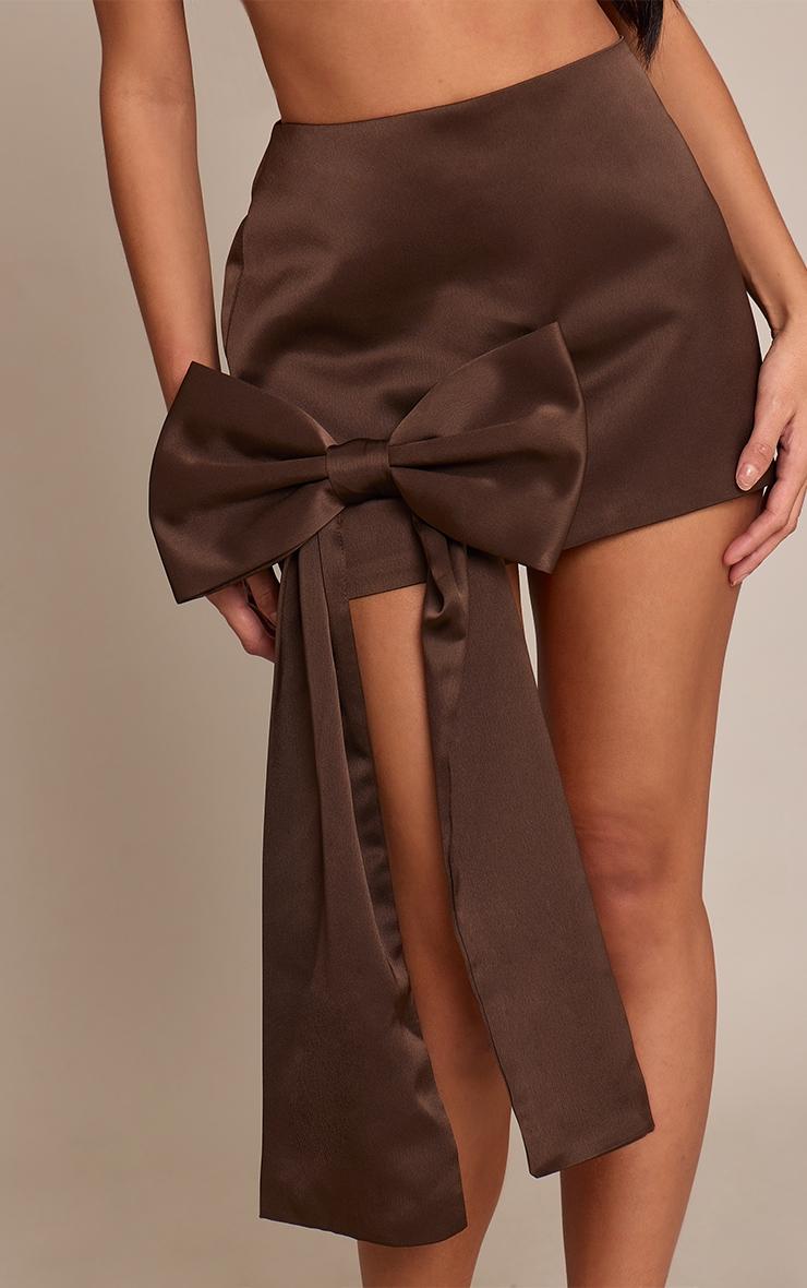 Redefine eveningwear with the chocolate satin bow mini skirt. Its chocolate satin boasts a statement bow and mini cut. Style with a chic bralette, pointed heels, and gold earrings.Length approx 33cm/13inch (Based on sample size US 4)Model wears size UK 8/ EU 36/ AUS 8/ US 4Model Height - 5ft 6inchp]:!mb-4inch>Brand: PrettyLittleThingCategory: BottomsProduct type: Mini SkirtColor: ChocolateMaterial: SatinOccasion: Evening