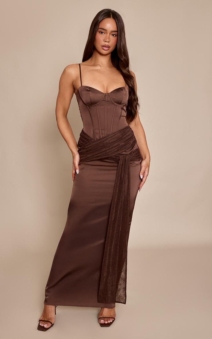 Own the night in the chocolate satin corset lace wrap detail maxi dress. This chocolate satin maxi showcases a structured corset with a sweetheart neckline and a distinctive lace waist wrap. Perfect for an unforgettable entrance at any evening event. Finish the look with delicate gold hoops and sleek kitten heels.Length approx 155cm/61inch (Based on sample size US 4)Model wears size UK 8/ EU 36/ AUS 8/ US 4Model Height - 5ft 8inchp]:!mb-4inch>Brand: PrettyLittleThingCategory: DressesProduct type: Corset DressColor: ChocolateMaterial: SatinOccasion: Evening
