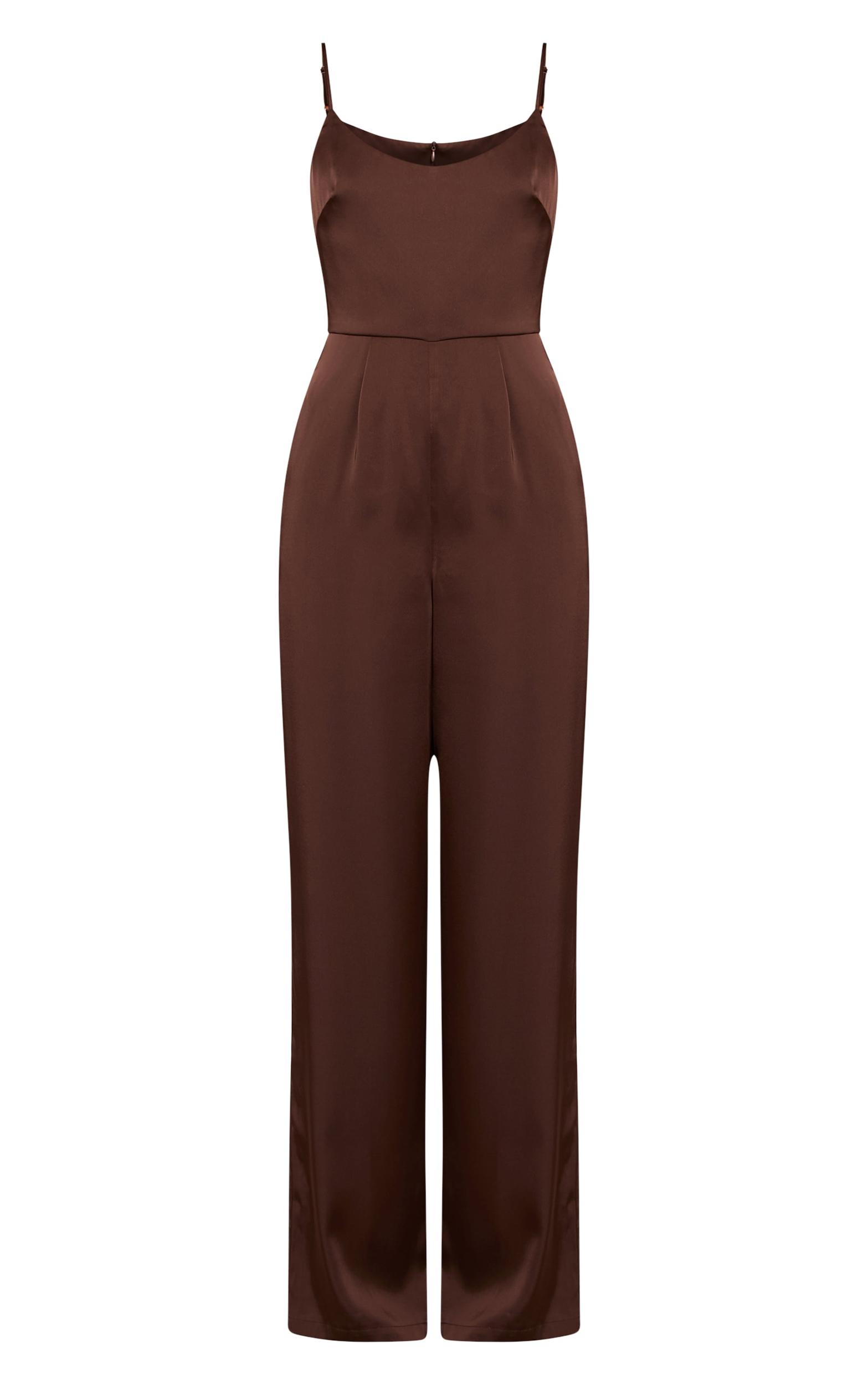 Step into confident evening style with the chocolate satin scoop neck straight leg jumpsuit. This artful piece presents a sleek scoop neckline, framed by delicate spaghetti straps, leading to a perfectly tailored bodice that flows into a contemporary straight leg silhouette in a rich chocolate hue. For a truly cohesive look, complete your ensemble with elegant nude heels and a refined black bag, ensuring your presence is both polished and self-assured.Length approx 155cm/61inch (Based on sample size US 4)Model wears size UK 8/ EU 36/ AUS 8/ US 4Model Height - 5ft 9inchp]:!mb-4inch>Brand: PrettyLittleThingCategory: DressesProduct type: Flared JumpsuitColor: ChocolateMaterial: SatinOccasion: Evening